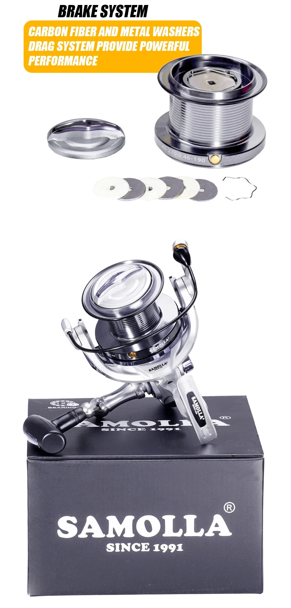 KSN8000 | Peso 20,81 oz/595g | Arrastre máximo 55LBS/25KG | Relación de engranaje 4,6: 1 | Capacidad de línea mono (LB/Yds) 8/210, 10/155, 12/125 | Capacidad de línea 0,20mm/390M, 0,24mm/270m, 0,26mm/230m