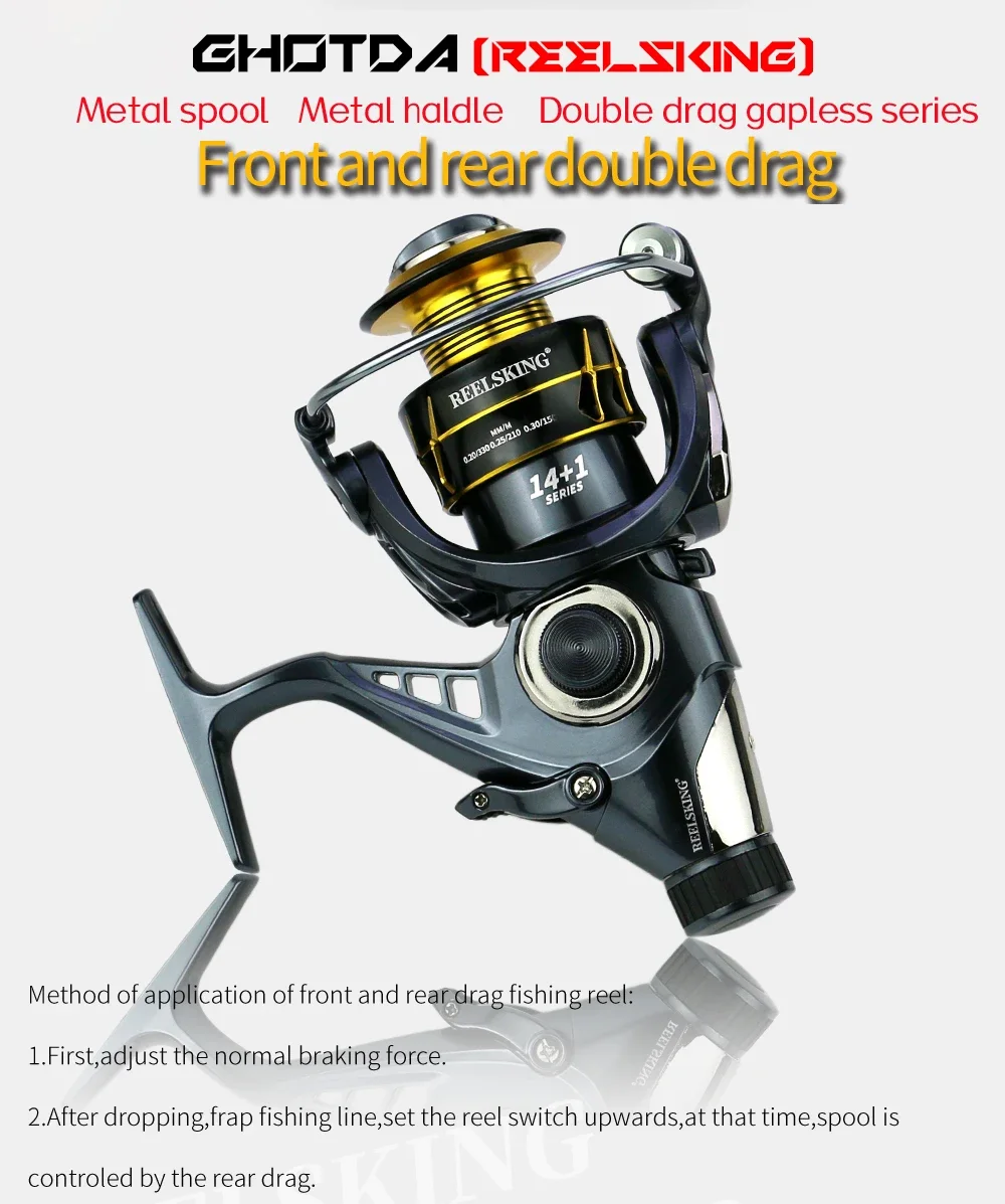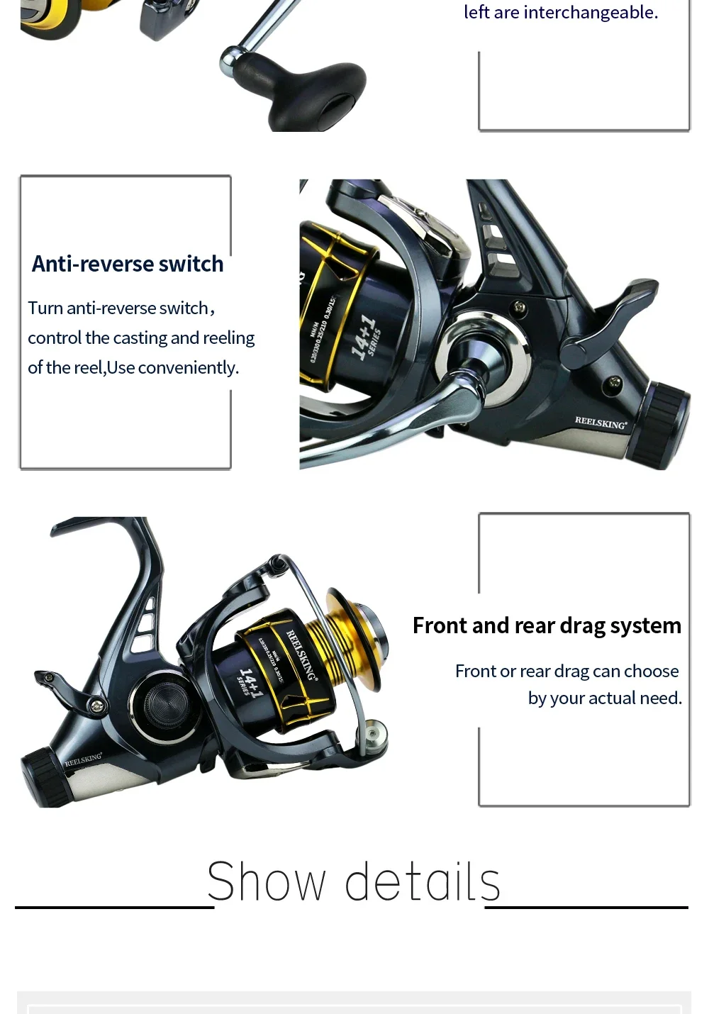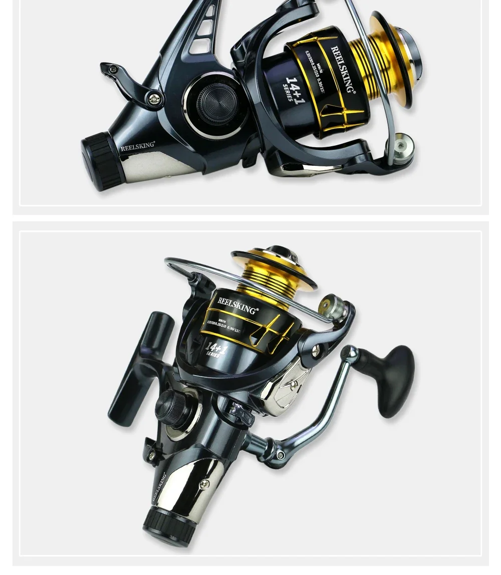 Tipo: carrete de freno doble delantero y trasero Brazo de roca: izquierda y derecha intercambiables Peces adecuados: peces de tamaño mediano y grande Varilla adecuada: varilla telescópica, varilla de roca, varilla de balsa y varilla de señuelo Relación de engranaje: 5,2: 1/4.9:1 Serie: 3000 4000 5000 6000 Carrete: Metal Brazo de roca: metal plegable Rodamiento Bakk: rodamiento unidireccional