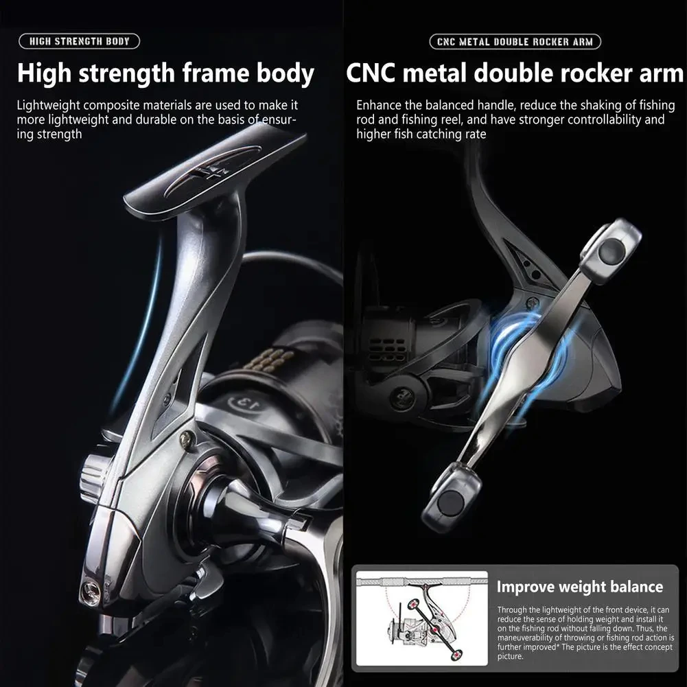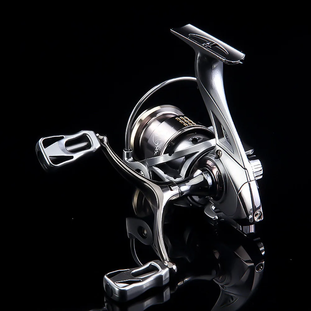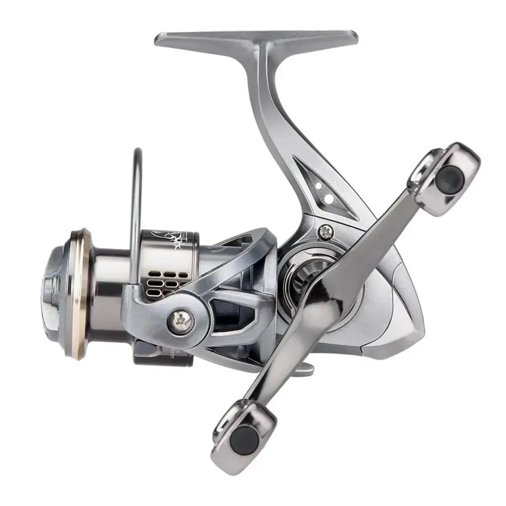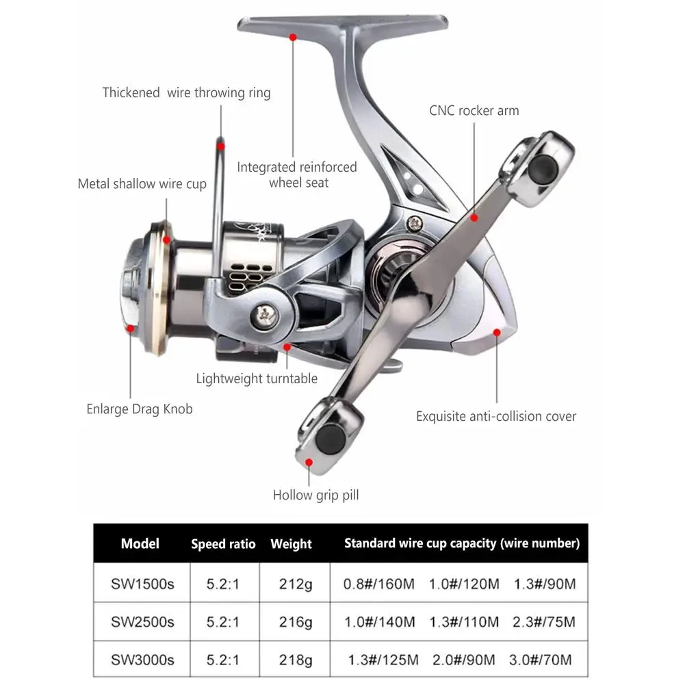 -- Las asas de doble brazo permiten un giro más equilibrado, mejorando el manejo de un señuelo profesional, ideal para la pesca de calamar.