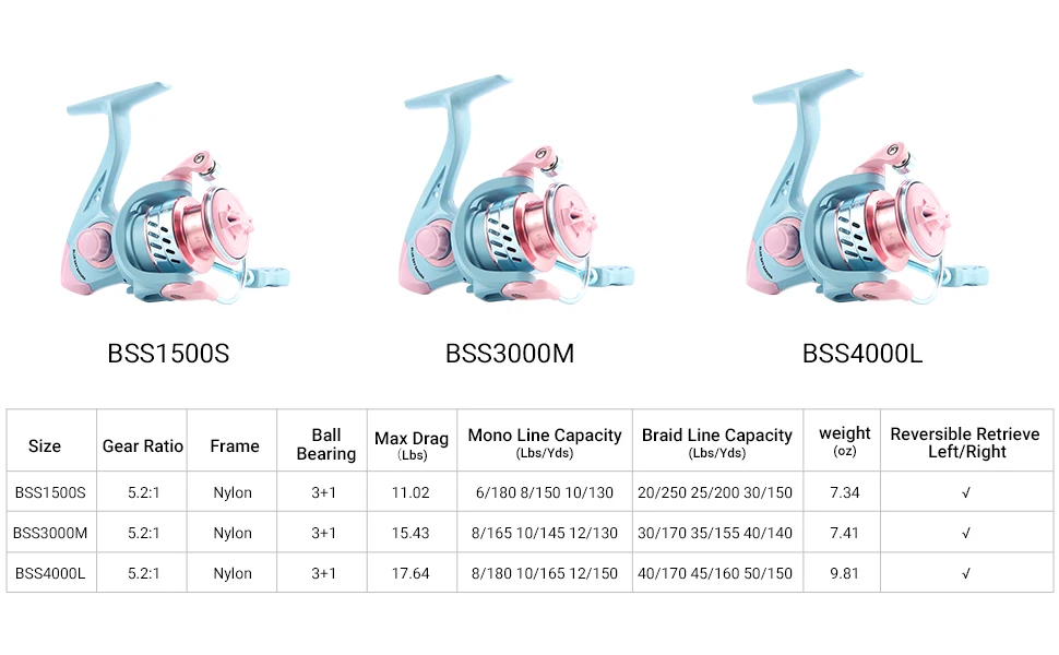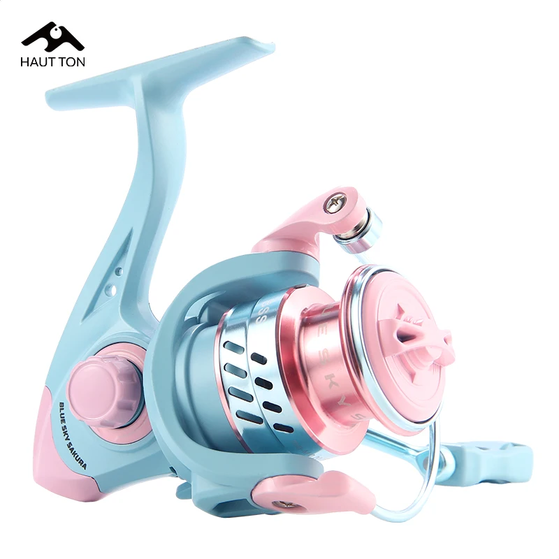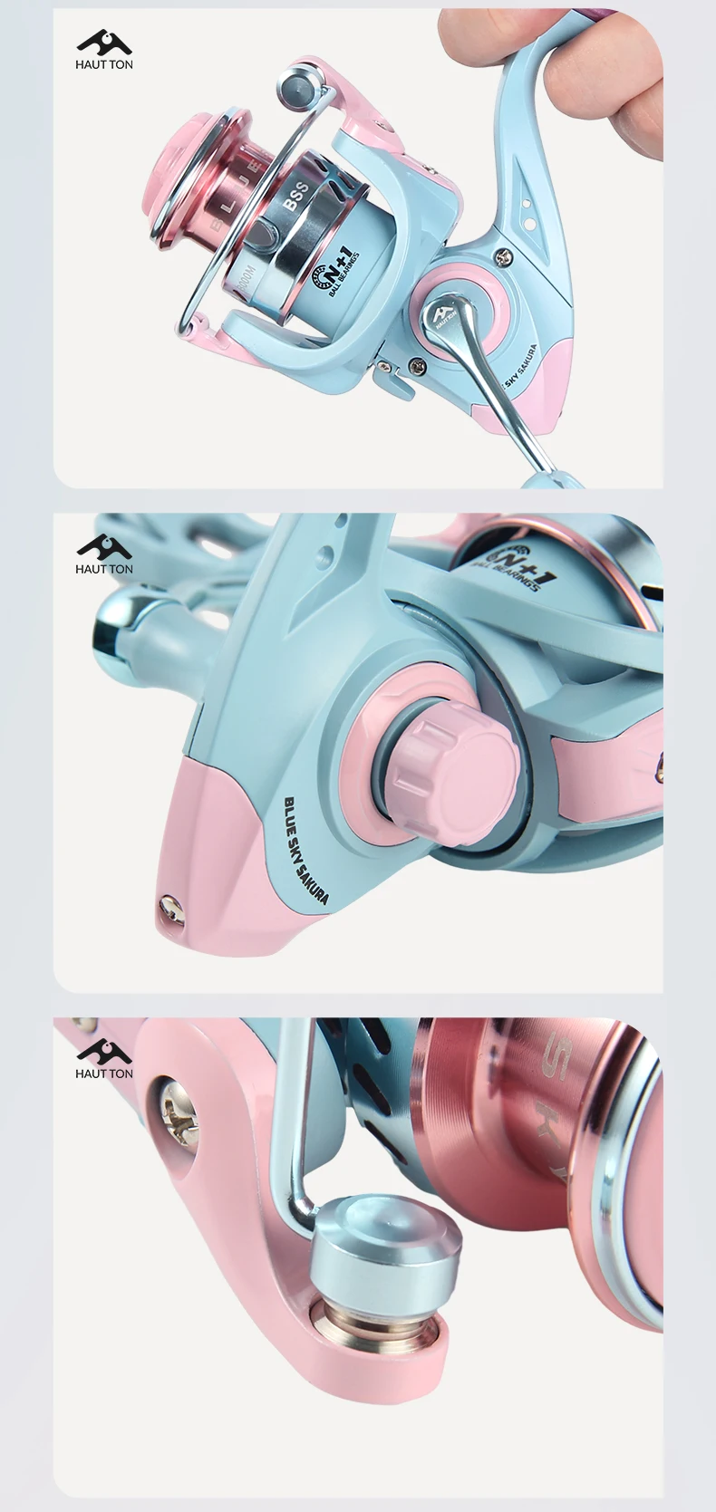 Carrete de pesca giratorio azul y rosa, 1500-4000, relación de engranaje 5,2: 1, arrastre máximo de 8kg, suave y sensible para fundición de larga distancia