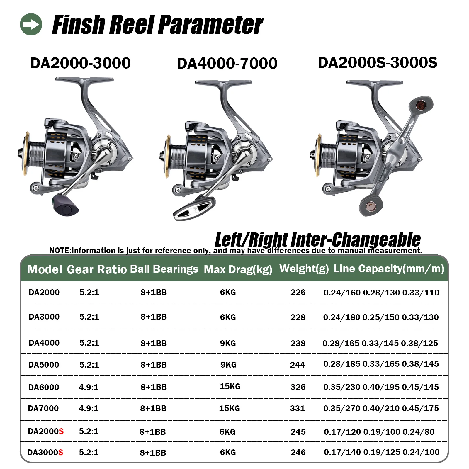 DA3000 | Peso: 228g | Relación: 5,2: 1 | Arrastre máximo: 6kg | Capacidad de Línea: 0,24/180 0,25/150 0,33/130