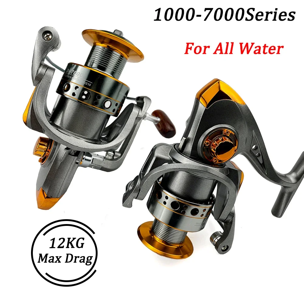 Carrete de pesca giratorio con copa de alambre de Metal, arrastre máximo de 12KG, potente, para agua salada y dulce, serie 1000-7000. 5,2: 1