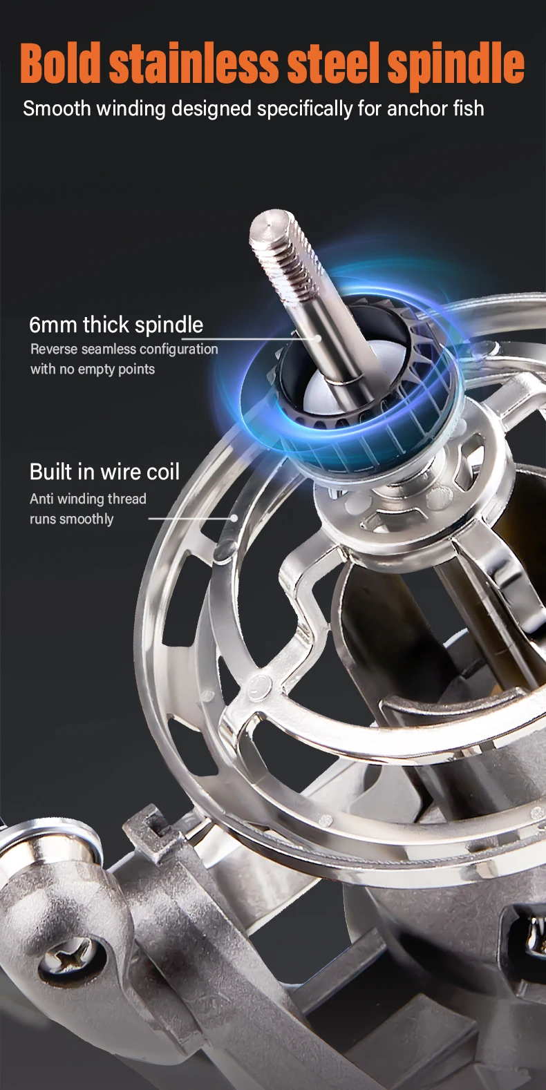 6.Husillo audaz de acero inoxidable, bobinado suave, especialmente diseñado para anclar peces; Husillo de 6 mm de espesor; Configuración inversa sin costuras sin puntos vacíos