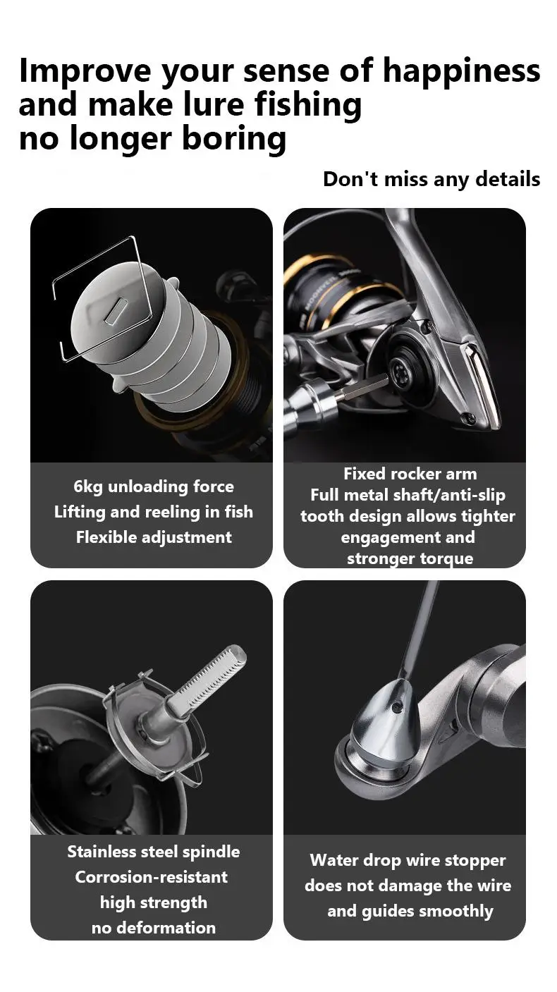 7. La fuerza de descarga de 6 kg puede ajustar de manera flexible el tirón y el deslizamiento del pez; balancín fijo, eje totalmente metálico + dientes antideslizantes, par de mordida apretado; El husillo de acero inoxidable es resistente a la corrosión y de alta resistencia; El bloque de línea de gota de agua no daña la línea, la guía de alambre es suave y cada detalle mejora la felicidad de pescar.