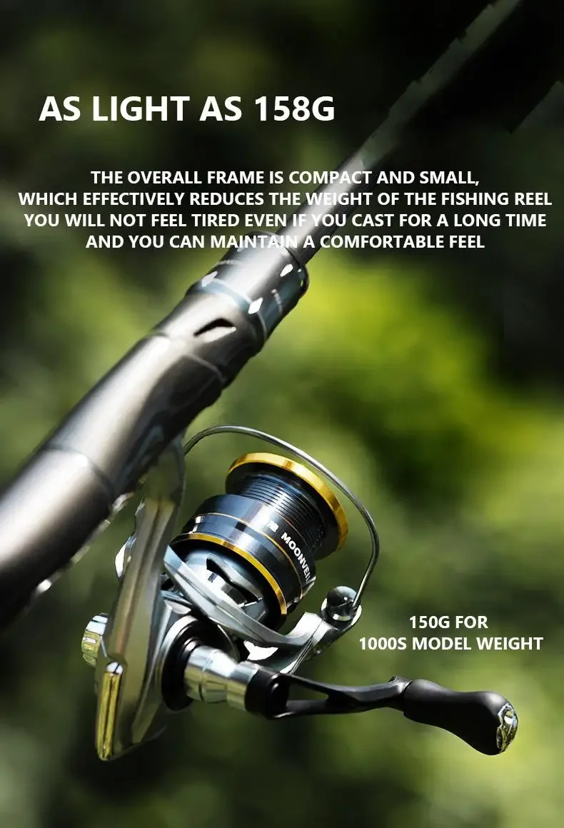 1.Tan liviano como 158 g (modelo de 1000), el marco general es compacto y pequeño, lo que reduce efectivamente el peso del carrete de pesca.No te sentirás cansado incluso si lanzas durante mucho tiempo y mantendrás una sensación cómoda.