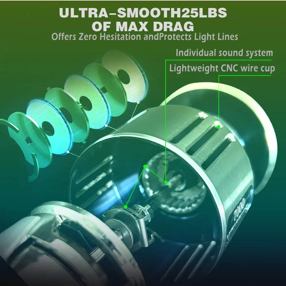 Si pesca una o dos veces y sus ruedas se oxidan y quedan inutilizables, no se preocupe. El material del rodamiento de esta rueda de pesca es un rodamiento de acero inoxidable de doble sellado, que es más suave que los rodamientos normales, impermeable y libre de óxido, y tiene una vida útil más larga.
