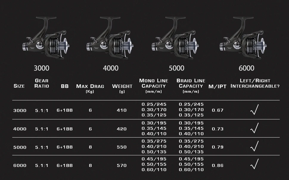 La diferencia de tamaño permite diferentes pruebas de libras y yardas para los carretes.Cuanto mayor sea el número, mayor será la prueba de libra que puede colocar en el carrete.