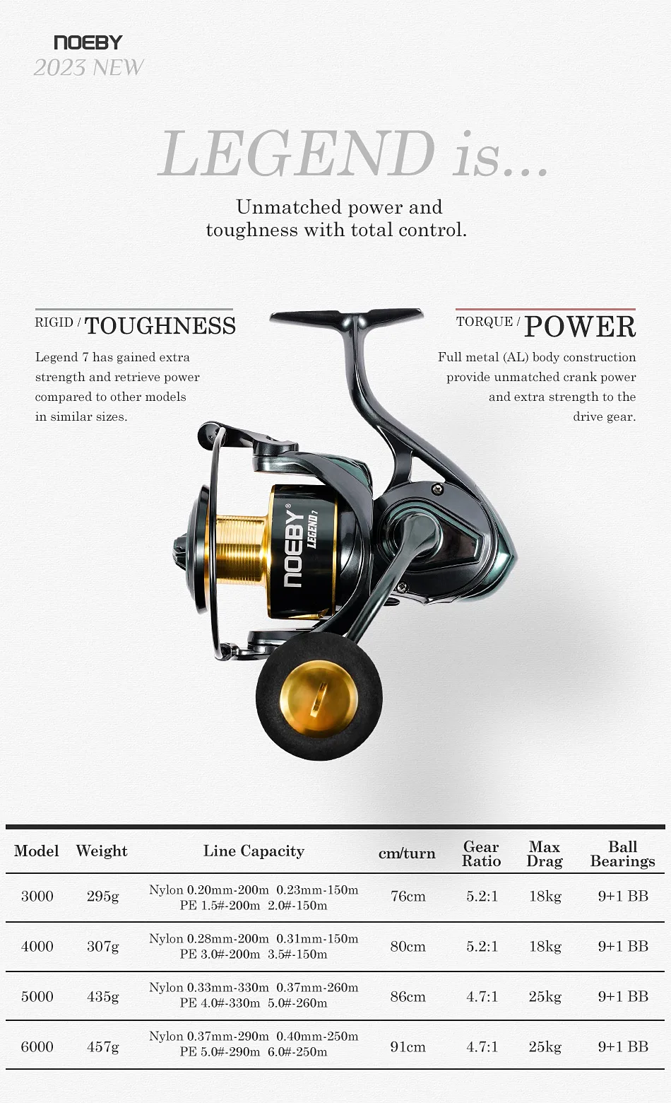 Carrete de pesca giratorio Noeby 3000 4000 5000 6000 serie 5,2: 1 relación de engranaje engranaje de aleación de Zinc arrastre máximo 18-25kg carretes de pesca de lubina