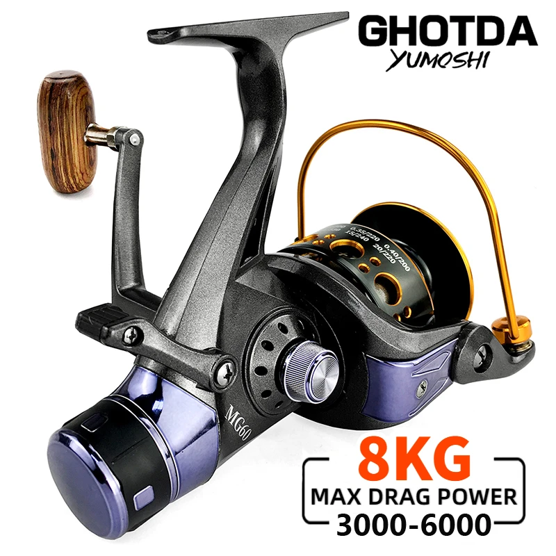 Carrete de pesca giratorio con sistema de freno doble delantero y trasero, serie 3000-6000, arrastre máximo de 8KG, carrete de Metal con relación de engranaje 5,2: 1 para todas las aguas