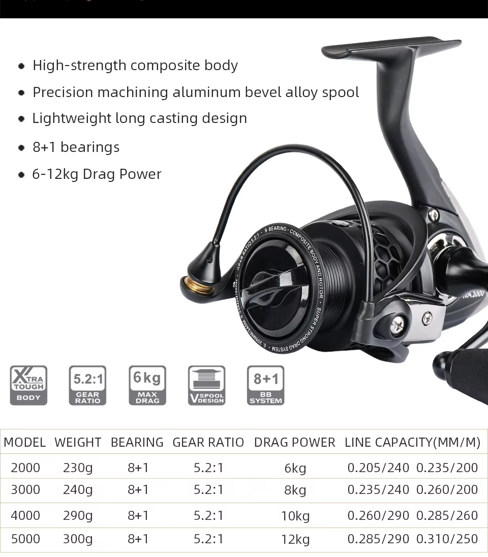 NA5000 | Peso: 300 g | Relación de engranajes: 5,2:1 | Rodamiento: 9BB | Arrastre máximo: 12 KG | Capacidad de línea (mm-M): 0,285/260