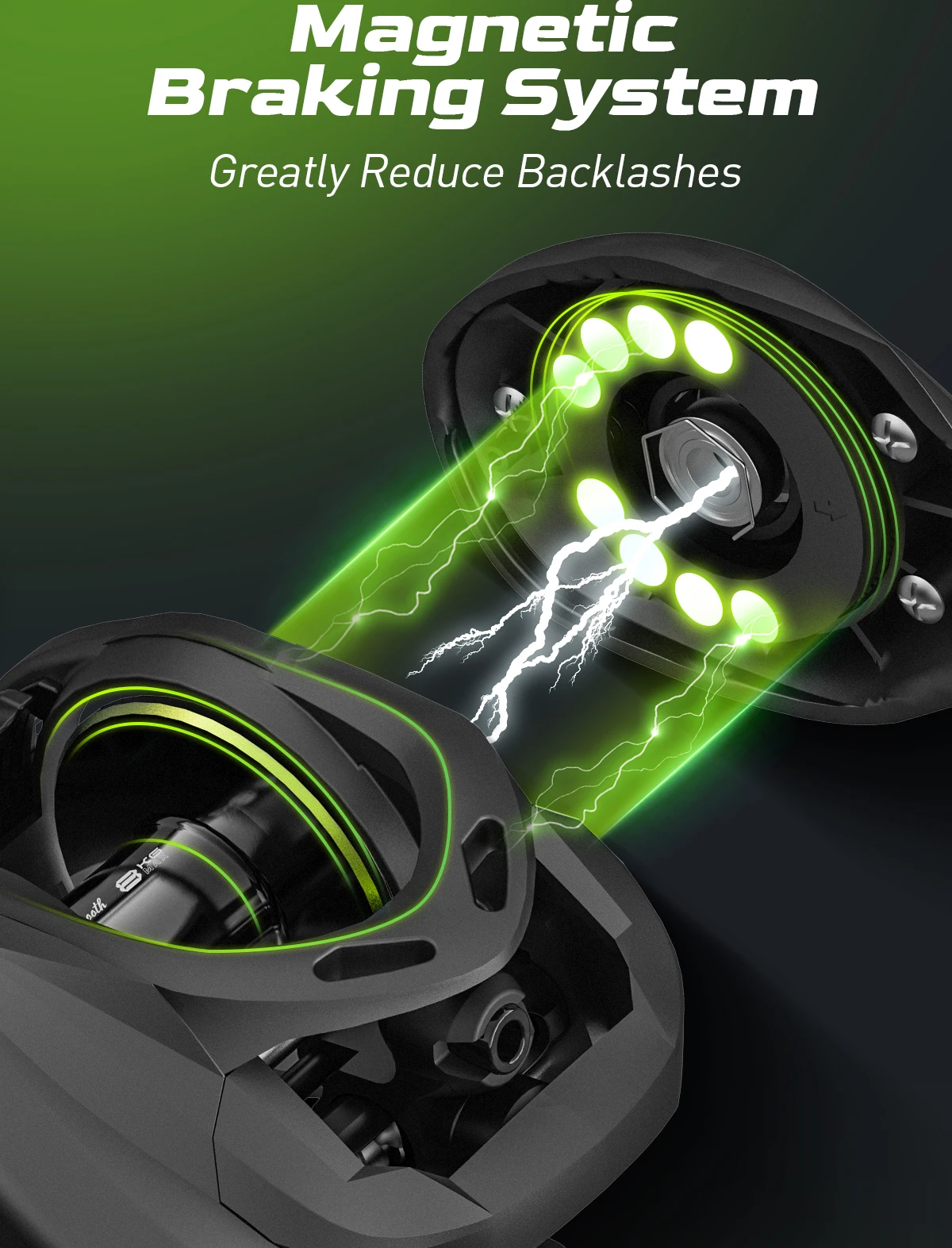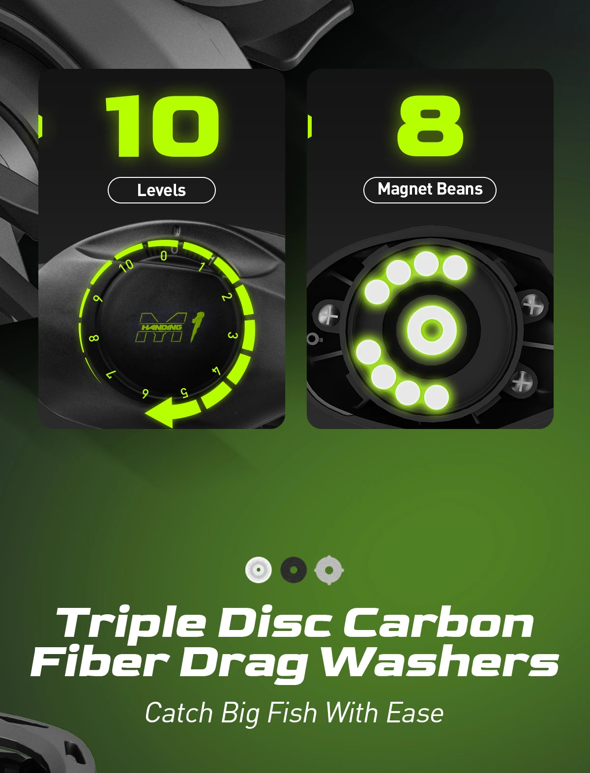 ●El carrete de pesca Baitcasting M1 puede ajustar eficazmente los frenos y la tensión del carrete utilizando un sistema de frenado magnético de 10 niveles con 30 pines y 8 frijoles magnéticos.