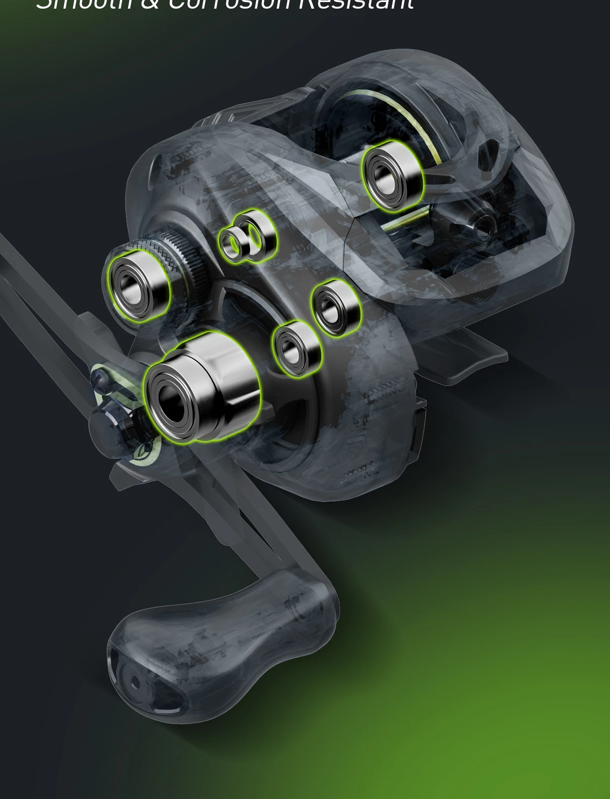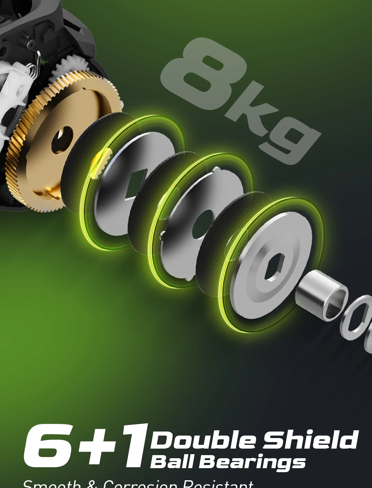 ●6 + 1 Rodamientos de bolas de acero inoxidable de doble escudo, que garantizan un rendimiento y confiabilidad duraderos.