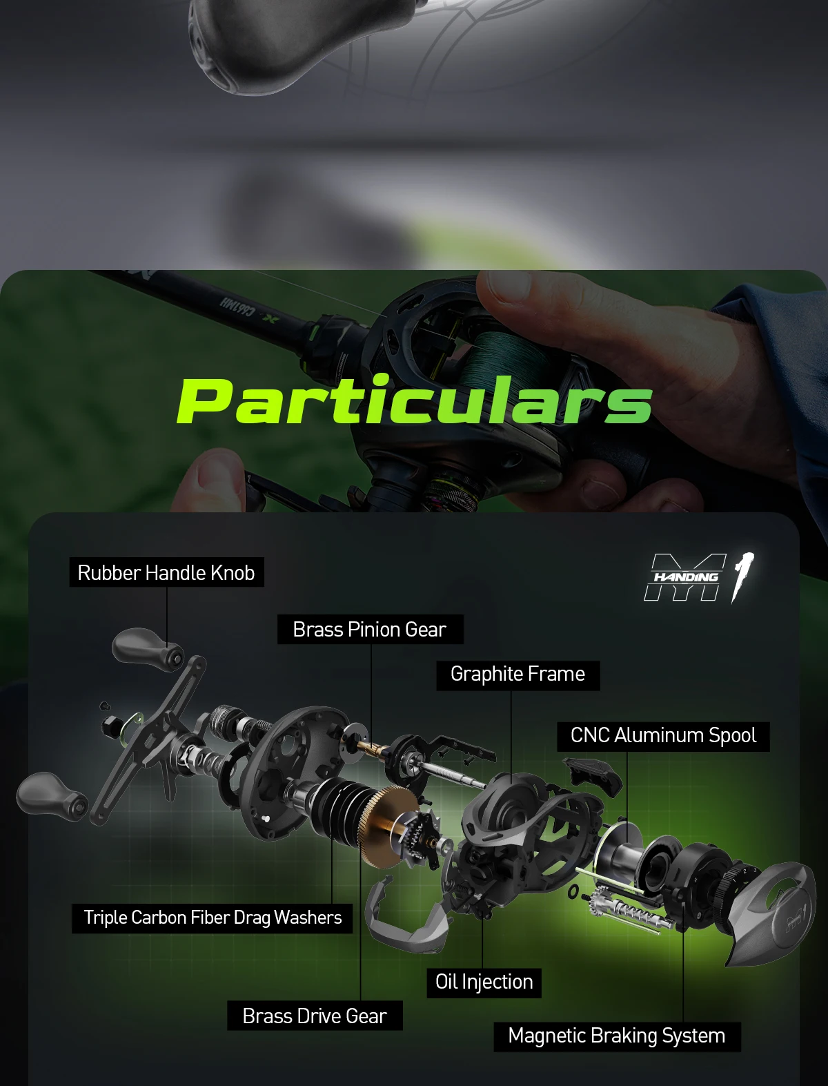 El carrete Baitcasting M1 es adecuado para todo uso, incluidos océanos, lagos, embalses, estanques y arroyos, con una fabricación precisa que proporciona un rendimiento preciso.