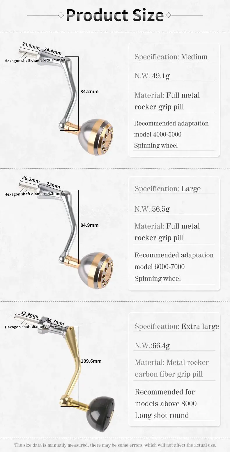 Empuñadura de brazo basculante de metal completo, plegable, tamaño mediano para carrete giratorio 2000-5000, tamaño grande para carrete giratorio 6000-7000