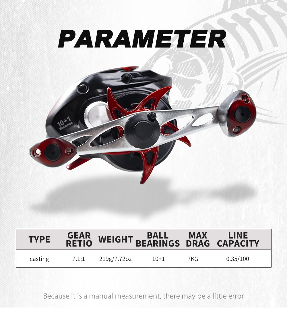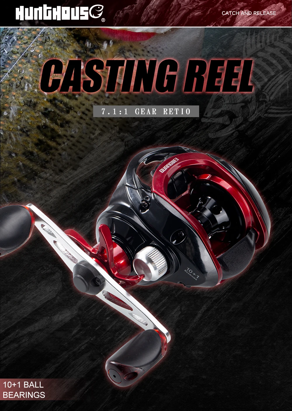 Carrete de pesca de lanzamiento Hunthouse Baitcast 10+1 7,1:1 Arrastre máximo 7kg agua salada 219g relación de engranaje de alta velocidad aparejos de peces de agua dulce