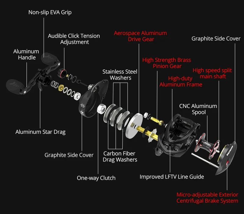 La relación de engranaje 10,5: 1 del carrete Baitcasting más rápido del mundoMarco de aluminio sólido excepcional para Cero flexión y bajo peso