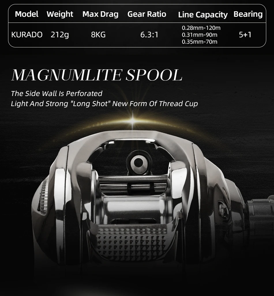 Relación: Serie 6.3:1: KURADO Tipo de cebo: Cebo falso Arrastre máximo: 8 KG