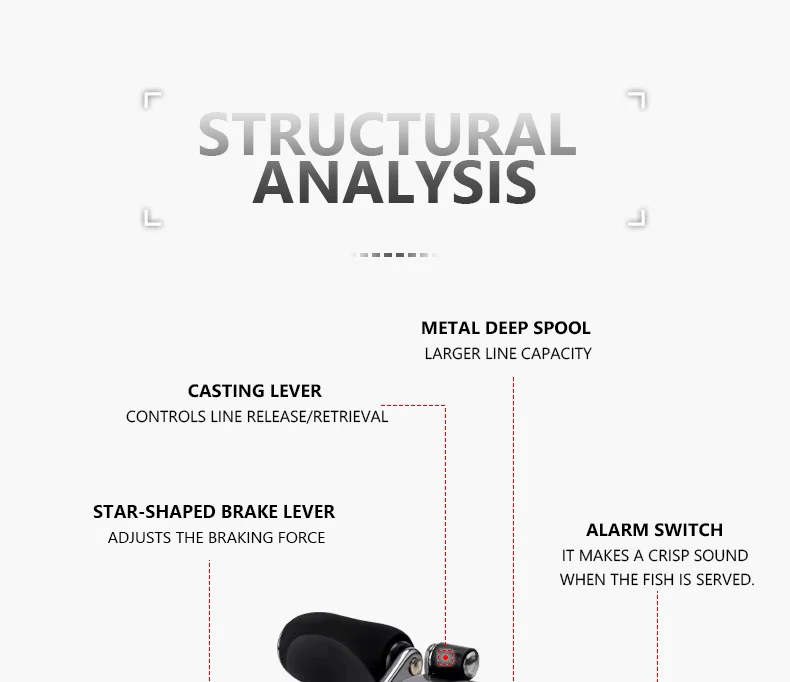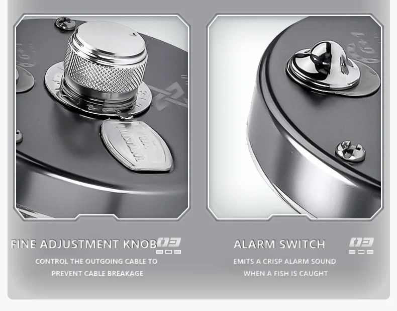El sistema de alarma de salida de línea incorporado con interruptor de encendido/apagado emite un sonido de clic nítido cuando un pez tira de la línea, lo que proporciona notificaciones claras de mordida.Los pescadores no necesitan mirar la punta de la caña constantemente y pueden captar la señal de golpe a tiempo incluso durante la pesca de larga distancia.
