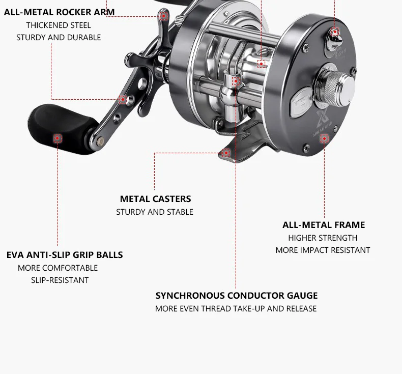 Las bolas de agarre antideslizantes de EVA ofrecen un agarre seguro y cómodo, lo que reduce la fatiga de la mano durante sesiones de pesca prolongadas.La palanca de fundición permite controlar con un solo clic la liberación y recuperación de la línea para un funcionamiento eficiente.Las patas del carrete de metal brindan un soporte estable, evitando que se tambalee cuando se montan en la varilla para mejorar la estabilidad general del manejo.