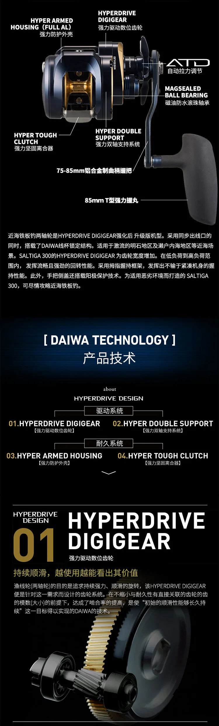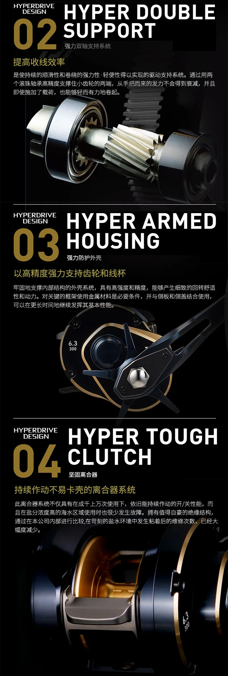 Equipado con HYPERDRIVE DIGIGEAR y soporte de doble rodamiento.La relación de transmisión dorada de 6,3:1 logra 86 cm por manivela, equilibra la velocidad y el par y garantiza una recuperación de la línea suave y potente incluso cuando se combate a peces grandes.