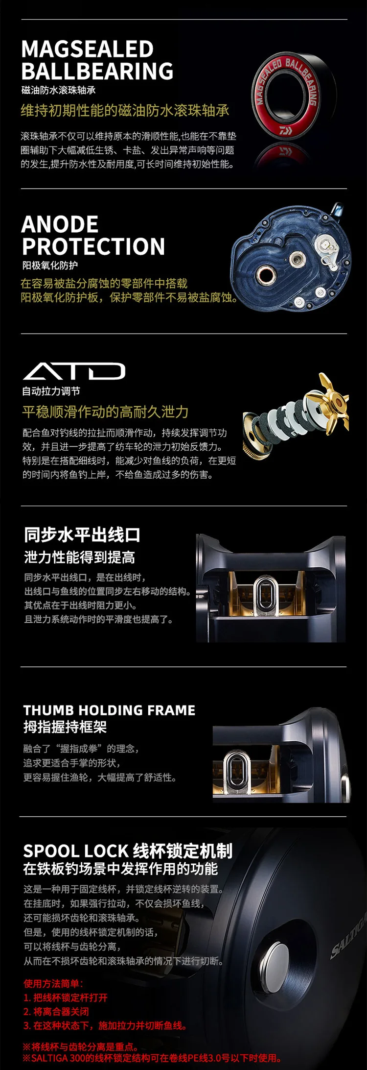El sistema de arrastre ATD de fibra de carbono proporciona una fuerza de frenado suave y fuerte de hasta 10 kg.Maneja fácilmente peces de agua salada de tamaño mediano, como pargo y aguarrás, lo que reduce la rotura del sedal y los riesgos de pérdida de peces.