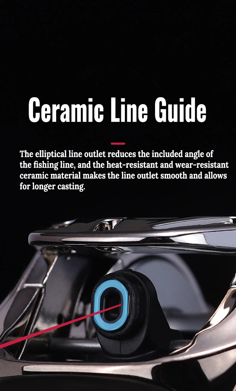 La salida elíptica del sedal reduce el ángulo incluido del sedal, y el material cerámico resistente al calor y al desgaste hace que la salida del sedal sea suave y permite una fundición más larga.