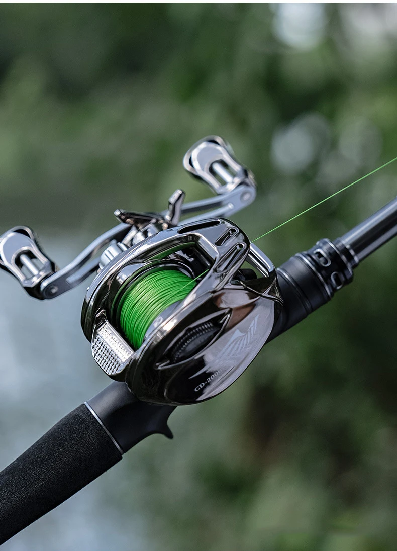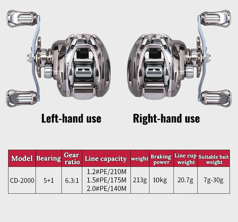 Modelo: CD-200; Rodamiento: 5 + 1; Relación de engranaje: 6,3: 1, capacidad de línea: 1,2 # PE/210M, 1,5 # PE/175M, 2,0 #/140M, 3,0 # PE105M;