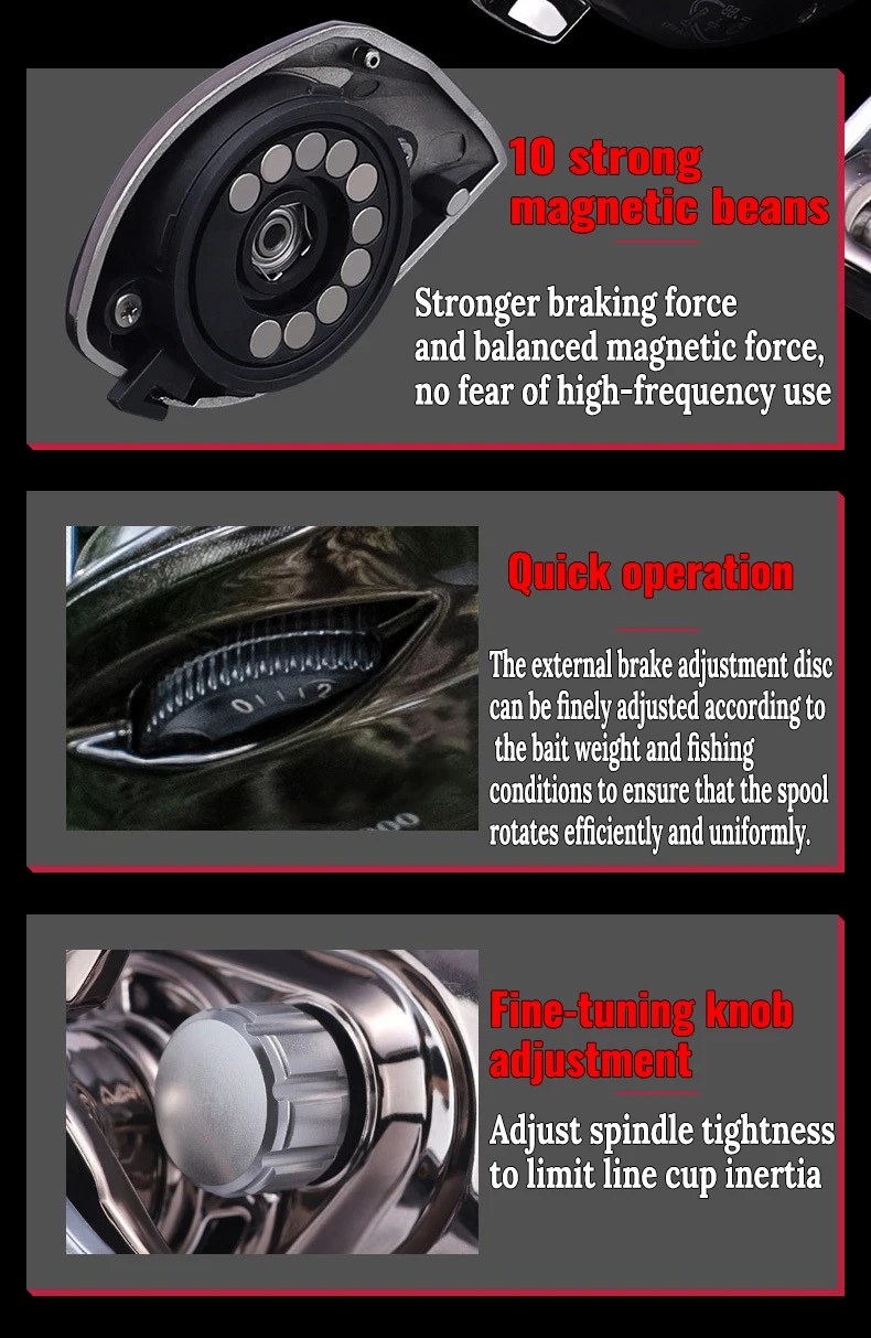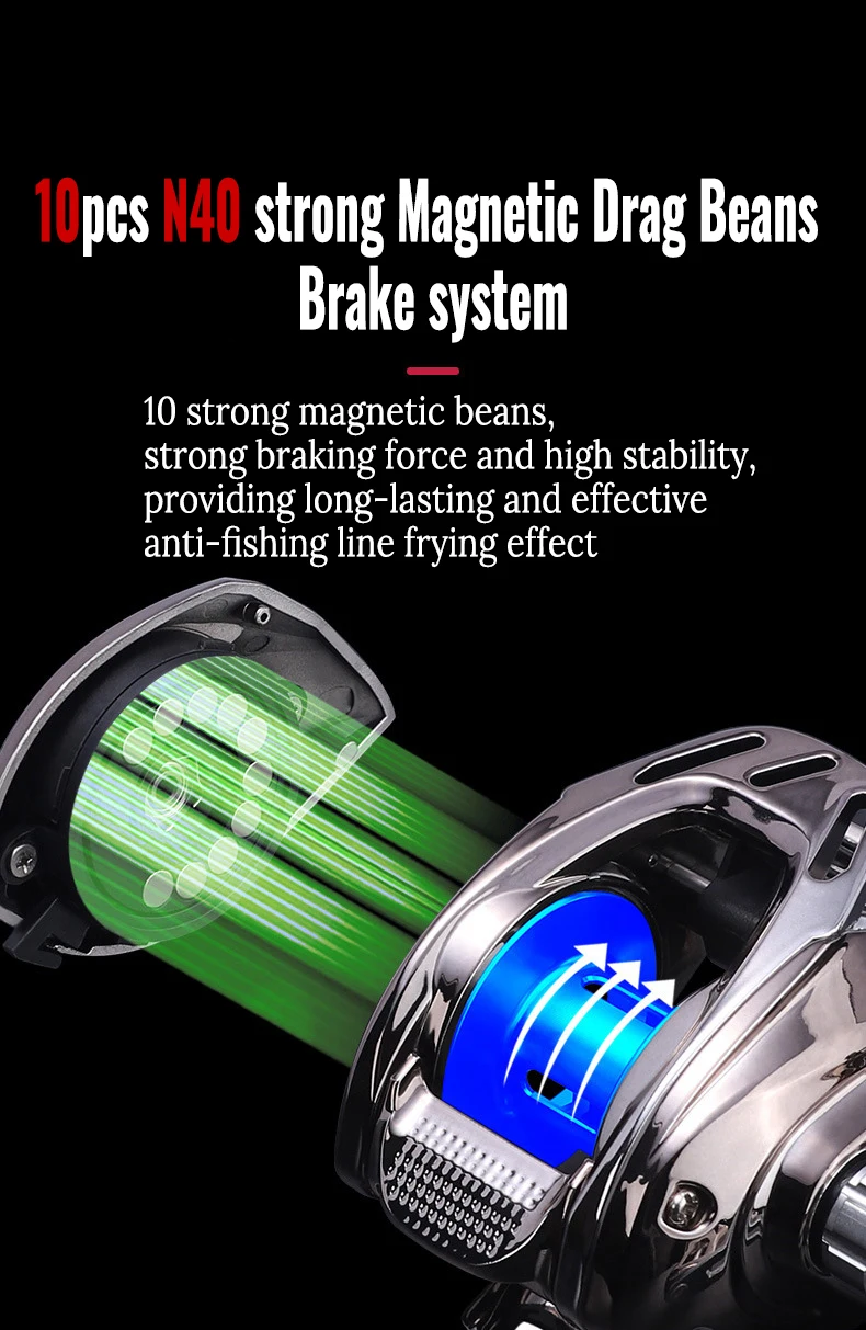 10 granos magnéticos fuertes, fuerte fuerza de frenado y alta estabilidad, proporcionando un efecto de fritura de hilo antipesca duradero y efectivo