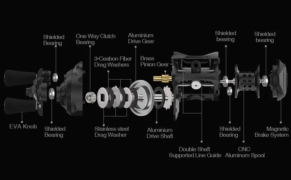 2.[Integridad estructural superior] Engranaje principal de aluminio endurecido de grado aeroespacial CNC diseñado con precisión con acabado anodizado, combinado con piñón de aleación de latón, ofrece una longevidad superior, triple resistencia a la corrosión/impacto/abrasión, asegurando el dominio en el combate de especies de peces trofeos.