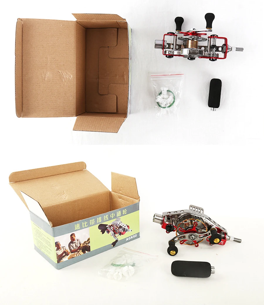 Parámetros del producto Nombre: AGK60 Relación de doble velocidad Función: cable automático Ámbito de aplicación Caña de pescar diámetro interior 11mm-24mm Cantidad de bobinado: 2 #300m Peso: 300g Fuerza de descarga: 8kg Rodamiento: 2BB Característica: Todo el lazo de alambre de cerámica Reduce la resistencia del sedal Flexible Sin línea de molienda