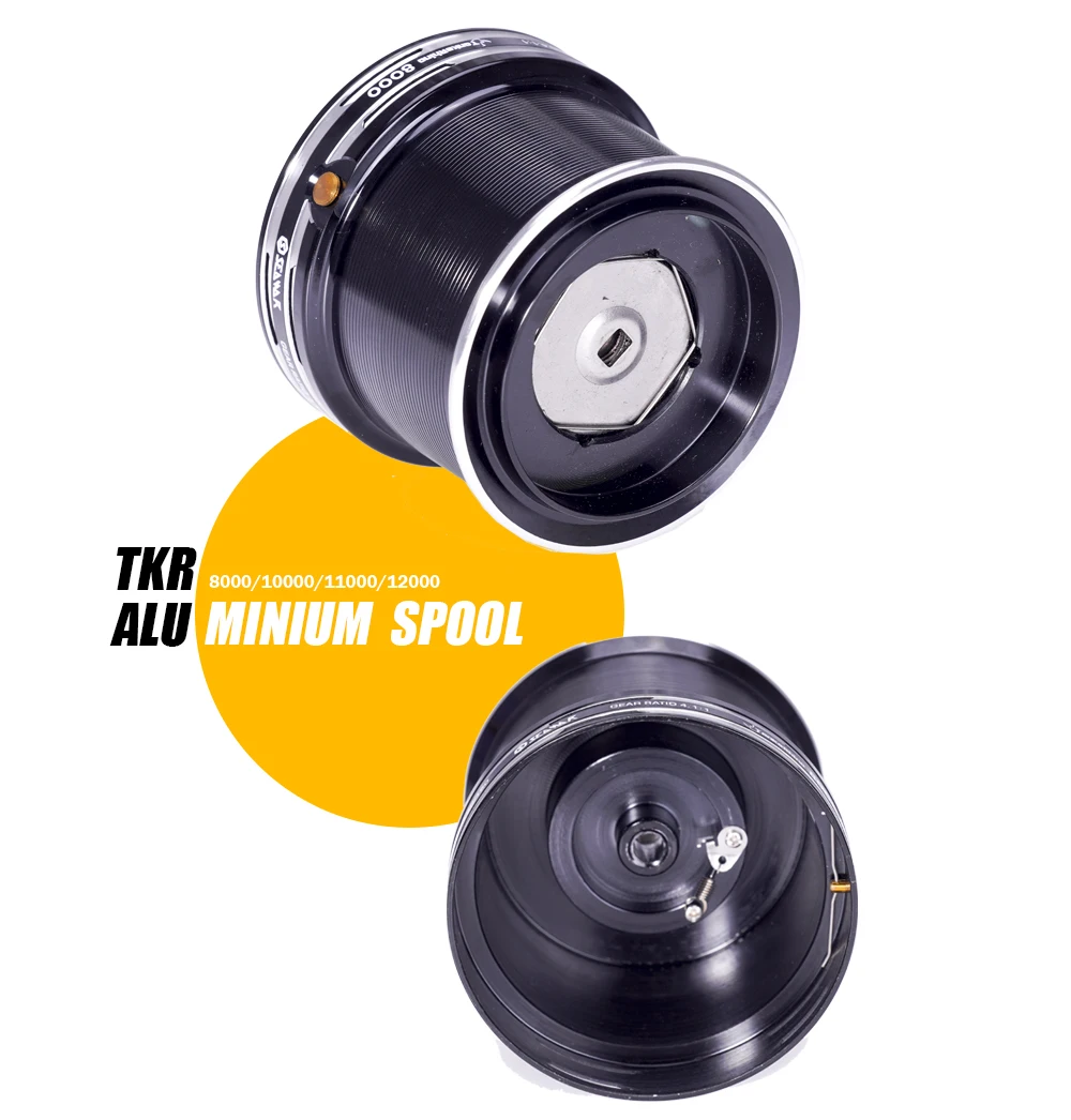 TKR 10000| Peso: 660 g| Relación: 4,1:1| Arrastre máximo: 27 kg| Capacidad de línea: 0,30/320 0,50/190 0,55/150