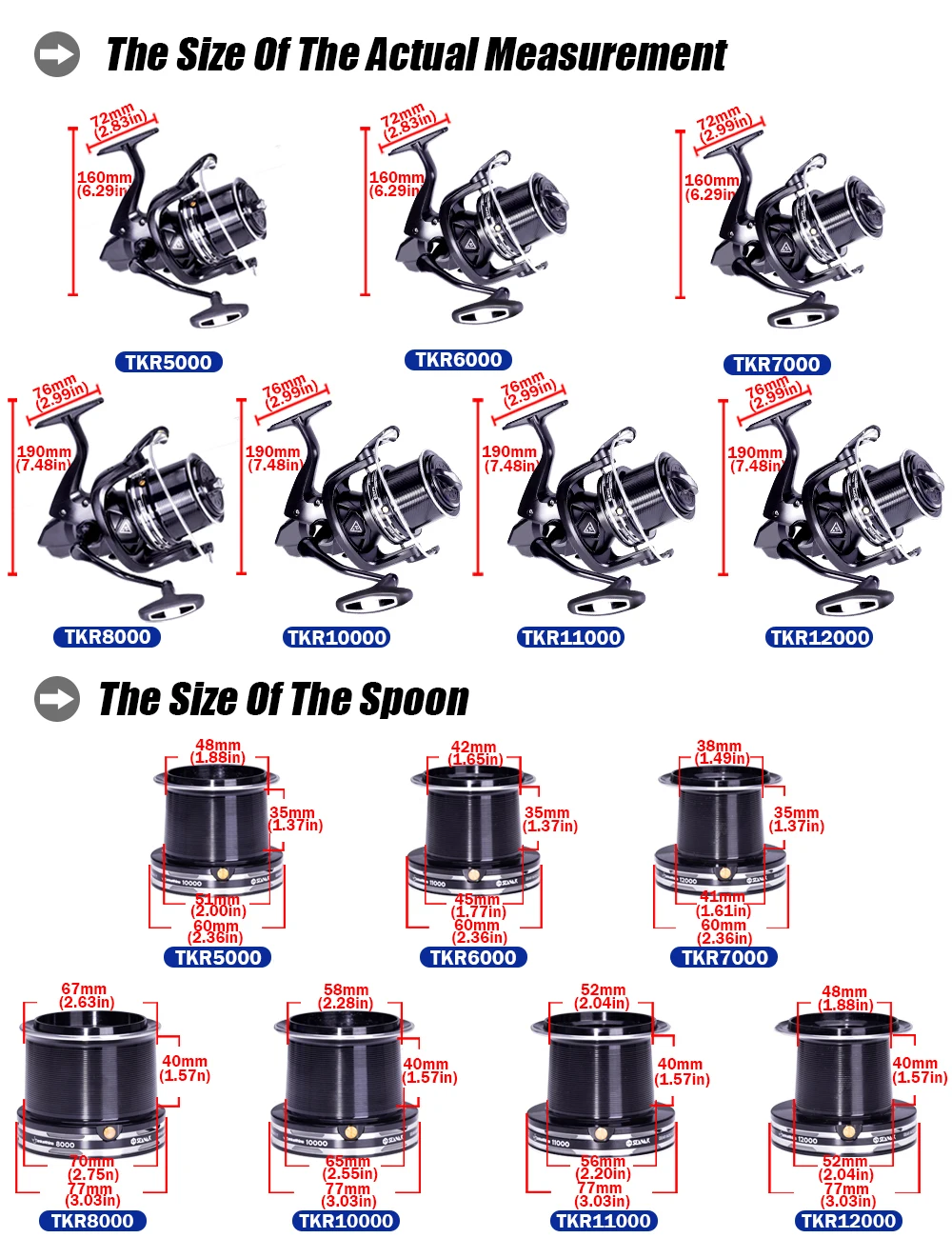TKR 6000| Peso: 530 g| Relación: 4,8:1| Arrastre máximo: 23 kg| Capacidad de la línea: 0,28 mm/420 m 0,30 mm/360 m 0,35 mm/300 m