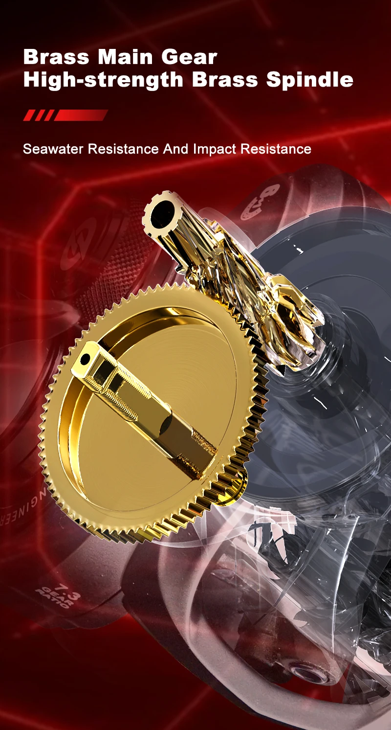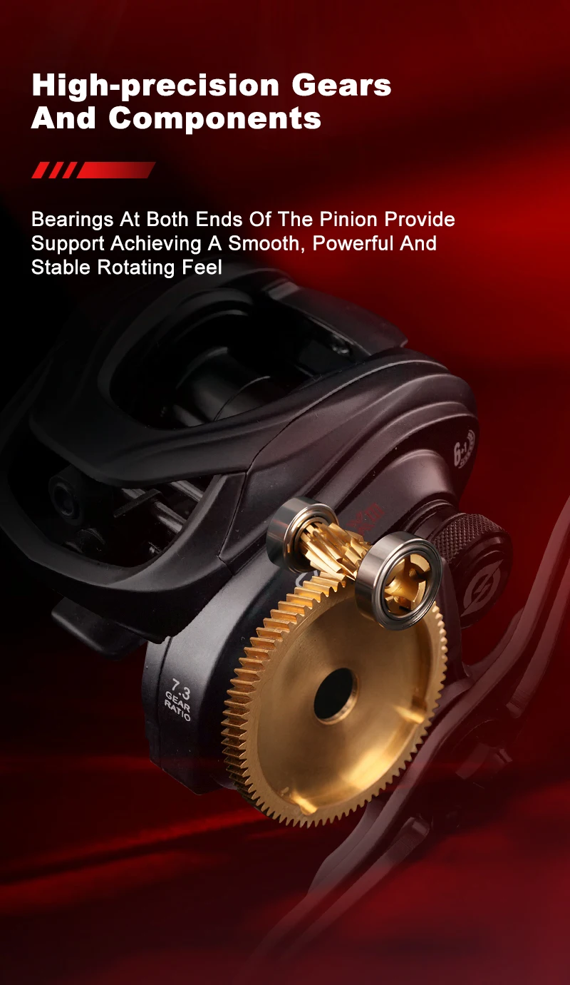 Un carrete de aleación de aluminio y un eje de acero inoxidable engrosado, lo suficientemente fuerte como para manejar lanzamientos potentes y la tracción de peces grandes.