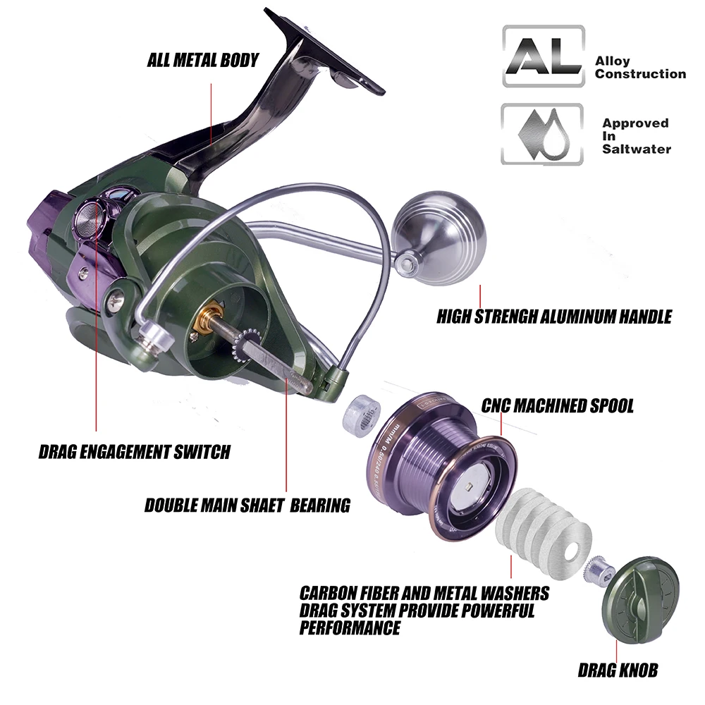 AFL 10000 | Peso: 789g | Relación: 4,0: 1 | Arrastre máximo: 25kg | Capacidad de la línea: 0,5mm/270m 0,55mm/230m 0,6mm/185m