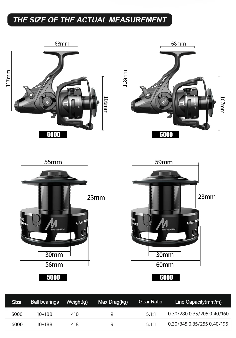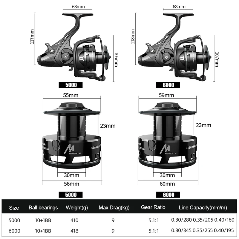 6000 | Relación de engranajes: 5,1:1 | Peso: 418 g | Rodamientos: 10+1BB | Arrastre máximo: 9 KG | Capacidad de línea: 0,30/345 0,35/255 0,40/195