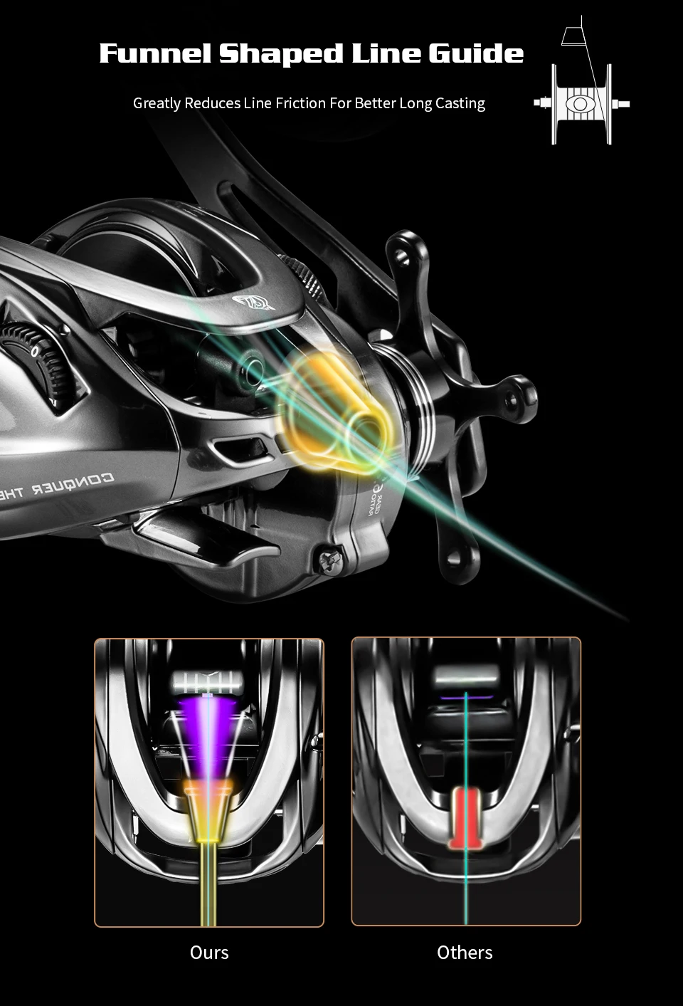 2. Por Primera vez usando, por favor ajuste la fuerza de frenado a un máximo de 5 lvet para evitar la reacción de la línea de pesca Luego Ajuste gradualmente el nivel de acuerdo con el peso del cebo para lograr la distancia de lanzamiento más lejana