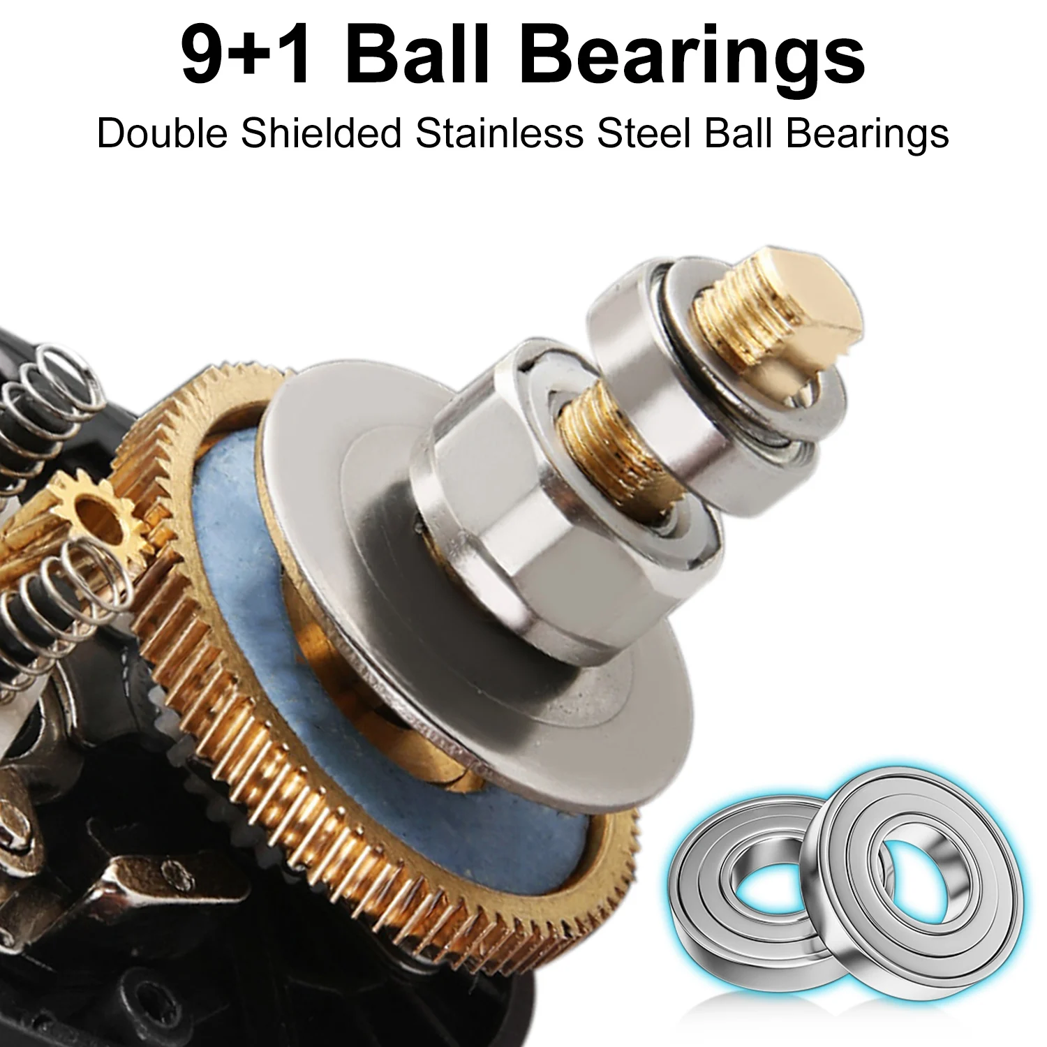 4. El Sistema de engranajes de doble rodamiento proporciona un carrete más ligero y fuerte contra cargas pesadas de hasta 17,6 libras.