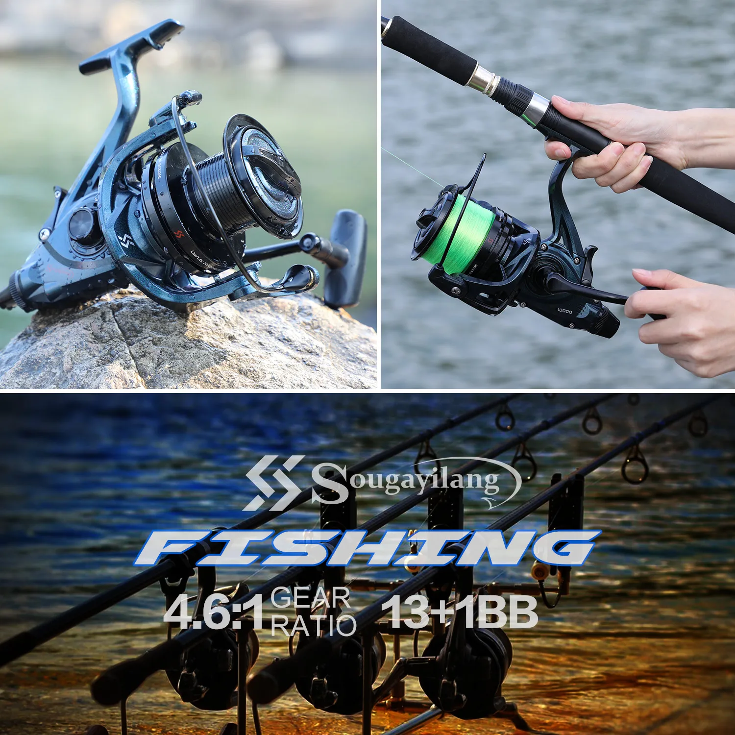 Carrete de pesca Sougayilang serie 9000-12000, carrete de pesca de Surf, carrete giratorio potente y ultra suave para pesca de carpa, pesca en el mar1. El eje de acero inoxidable del carrete de pesca de surf giratorio Sougayilang, el carrete de aluminio CNC y el mango derecho o izquierdo intercambiable ofrecen un carrete confiable para años de pesca en juegos grandes.