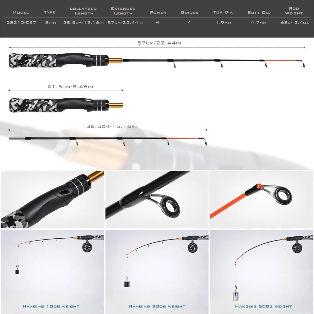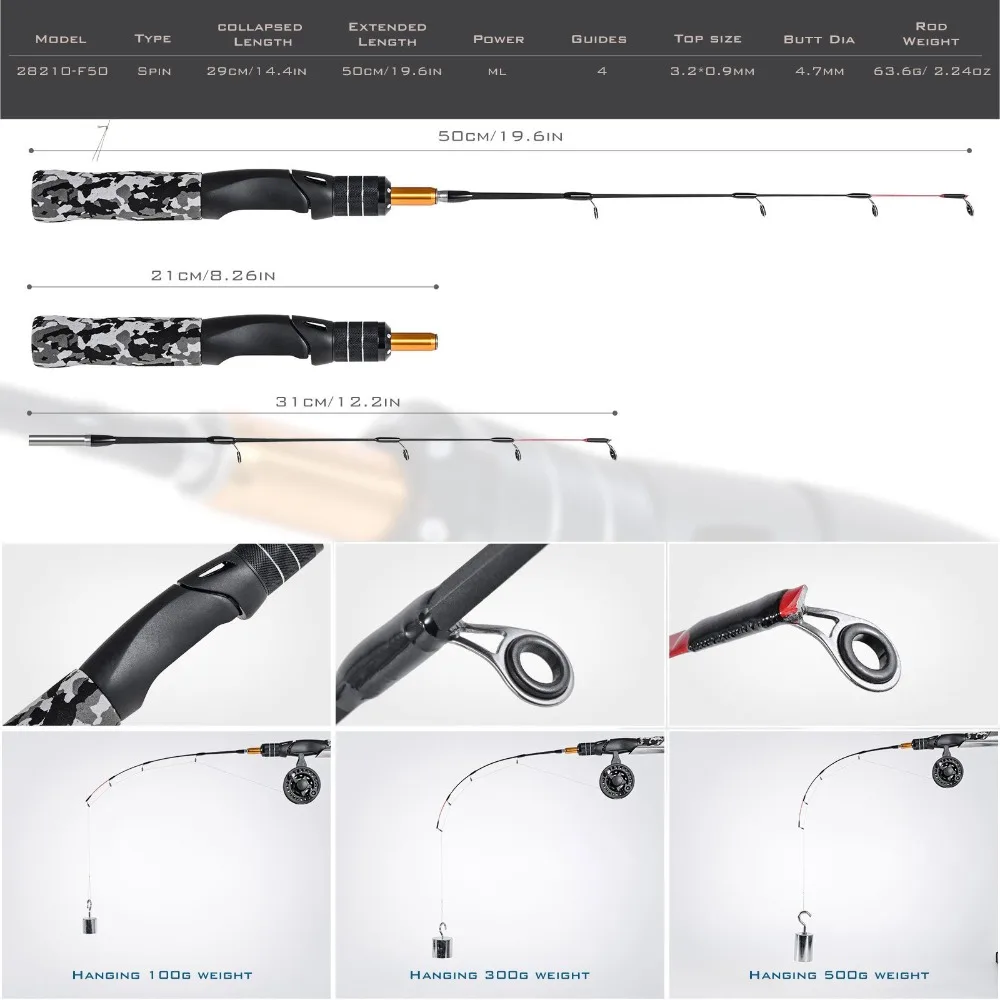 -High Quality and Durable Rod: The rod is made of solid proxy fiber and is 19.7" long. The EVA handle makes this rod as comfortable as a rod can be, ensuring those long days on the ice are stress-free. The grade D aluminium rings allow the line to flow effortlessly through them, making your ice fishing set up time as quick and easy as possible.