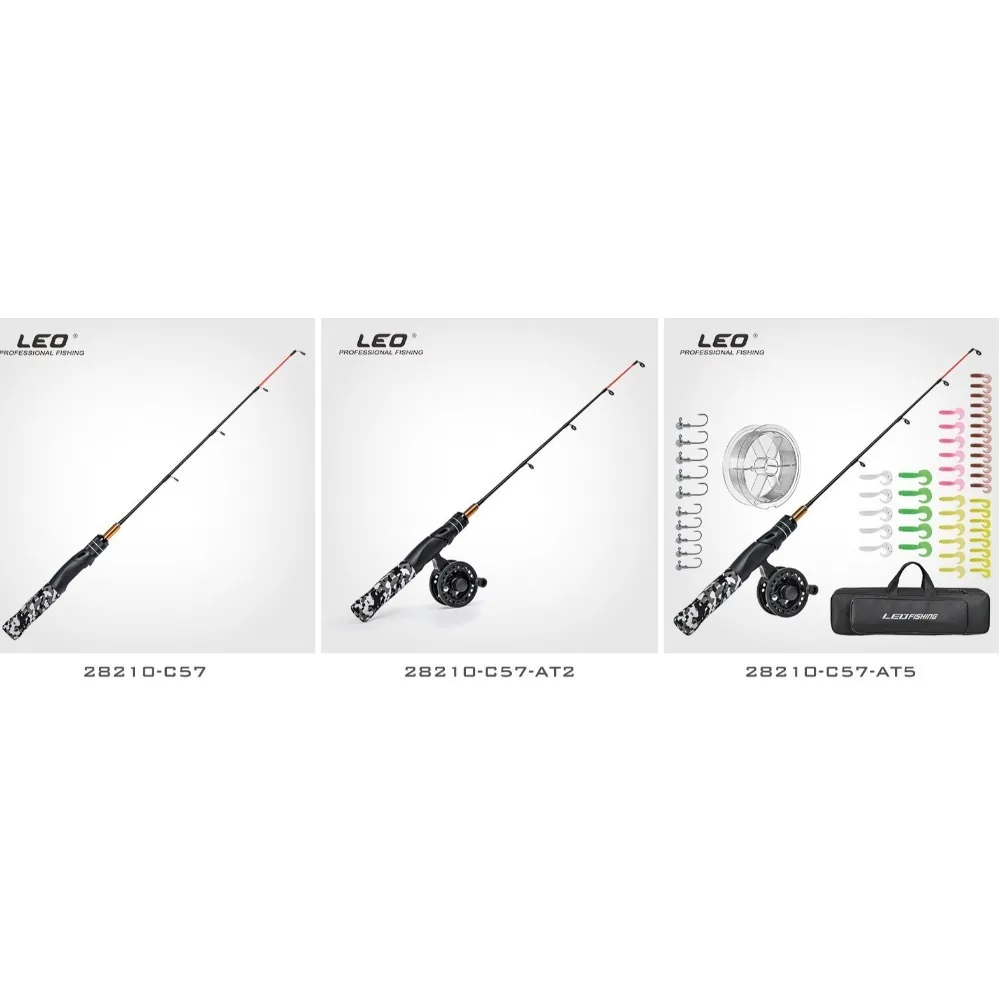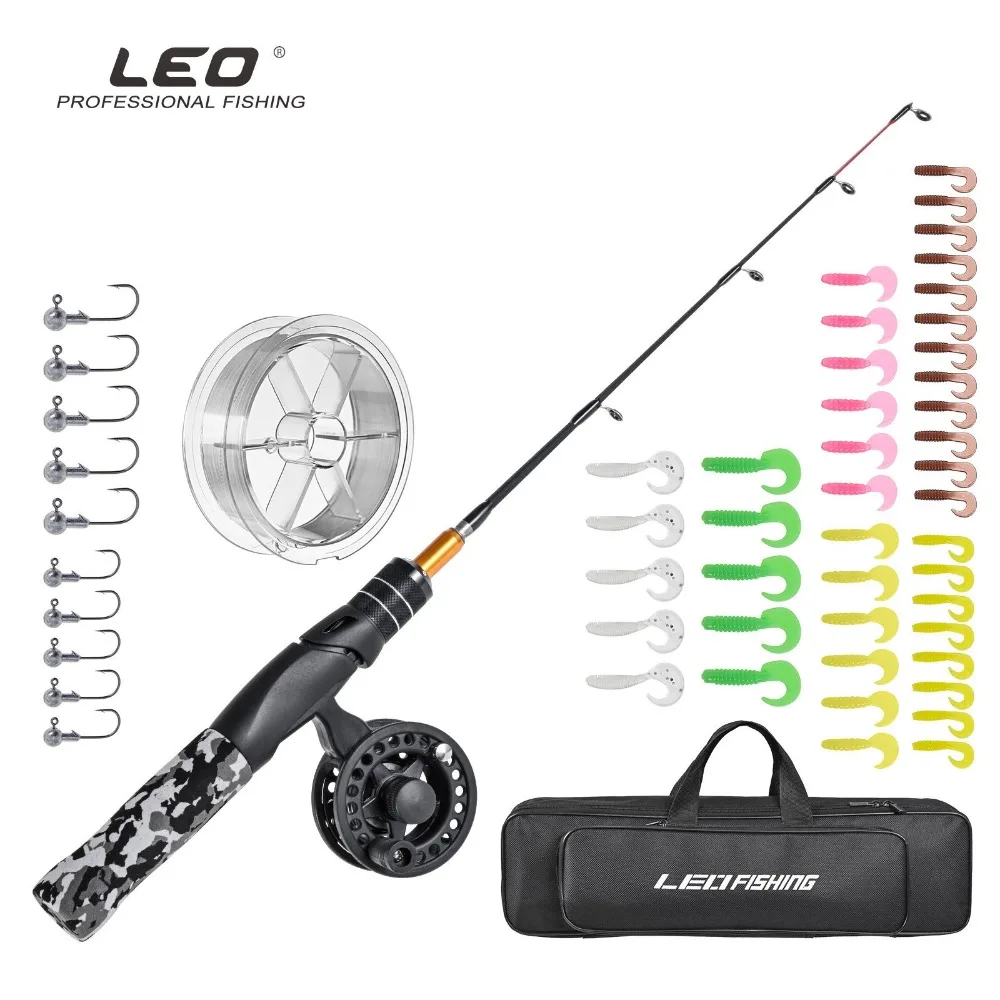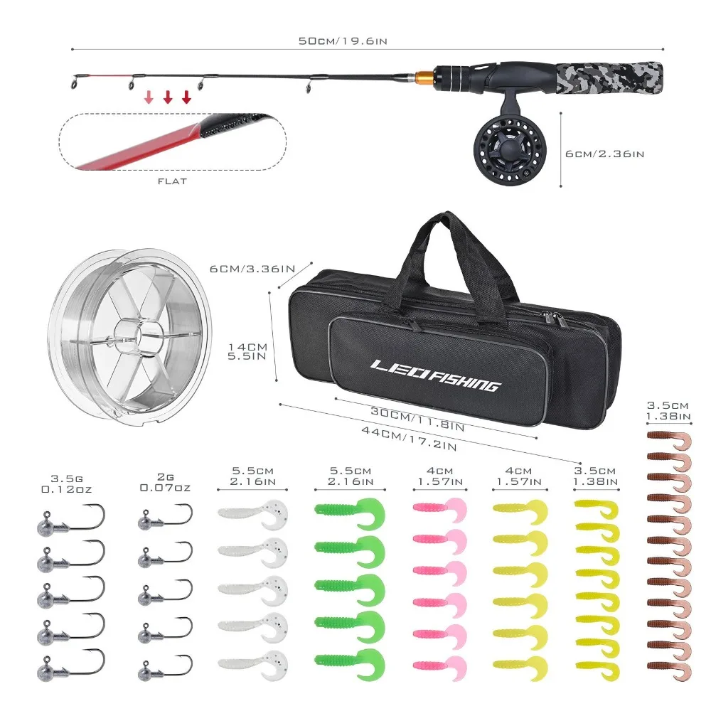 -Lure Accessoriess : The Frozen Lines winter ice fishing jigs have been carefully designed to produce real life-like imitations of a minnow. This swimming action is highly effective for freshwater and saltwater fishing, Also, the high quality and durable sharp treble hooks helps to ensure those fish do not escape PACKAGE:LEOFISHING Ice fishing rod set come with full kits, you can go ice fishing without any other purchase. There is :1* one piece ice fishing rod, 1* Reel(Wrap the line), 1*fishing carrier bag, 1* fishing lure box with full accessories such as :Jig,, hooks, floats, Soft Lures etc., which meet most of the needs of a beginner.