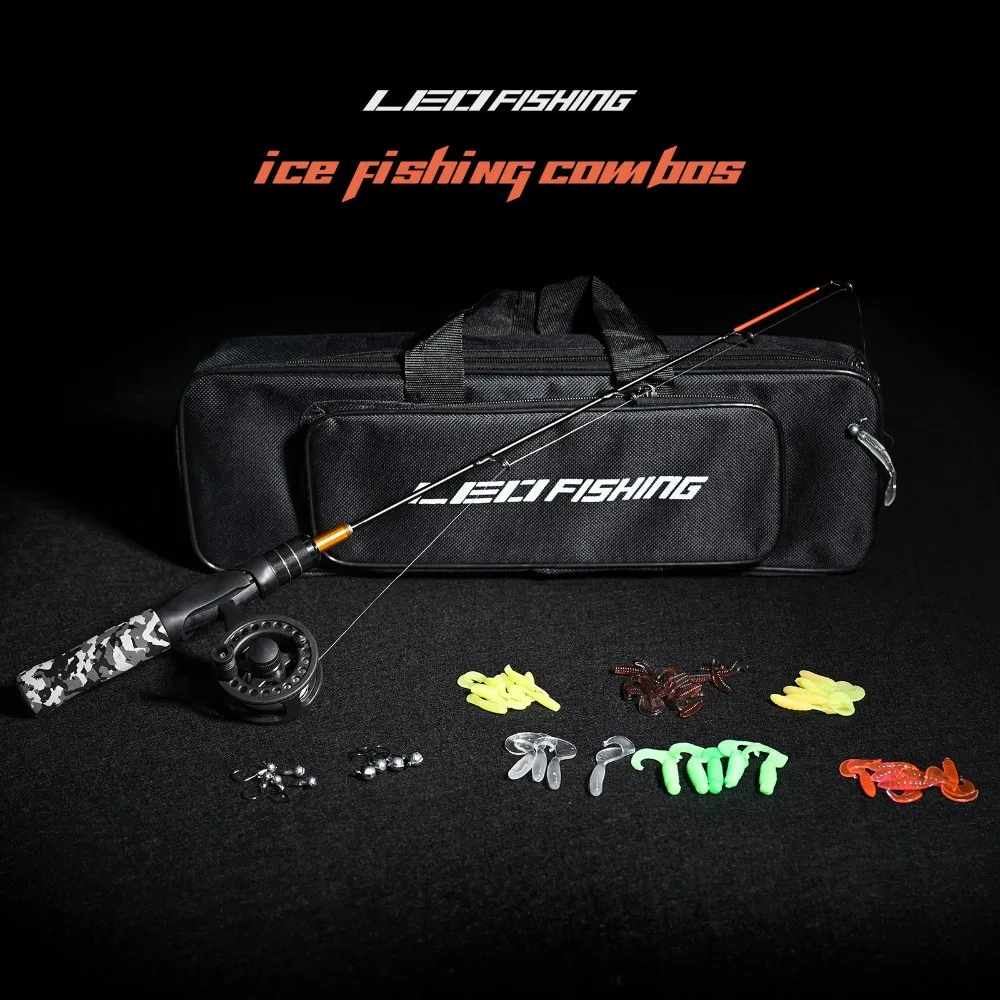 -Lure Accessoriess : The Frozen Lines winter ice fishing jigs have been carefully designed to produce real life-like imitations of a minnow. This swimming action is highly effective for freshwater and saltwater fishing, Also, the high quality and durable sharp treble hooks helps to ensure those fish do not escape PACKAGE:LEOFISHING Ice fishing rod set come with full kits, you can go ice fishing without any other purchase. There is :1* one piece ice fishing rod, 1* Reel(Wrap the line), 1*fishing carrier bag, 1* fishing lure box with full accessories such as :Jig,, hooks, floats, Soft Lures etc., which meet most of the needs of a beginner.