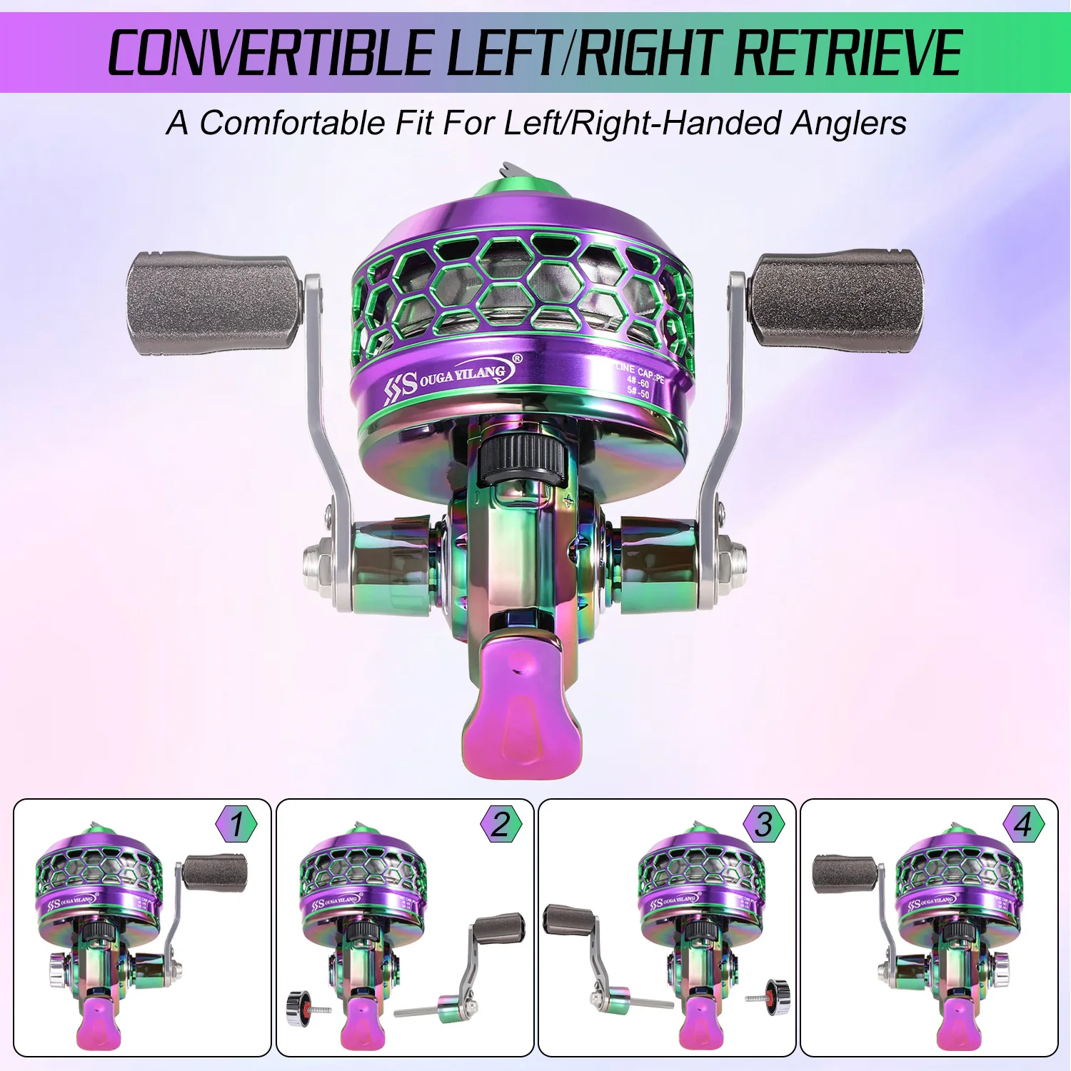 MANGO REVERSIBLE: a diferencia de la mayoría de los carretes giratorios, el carrete de pesca con botón Sougayilang cuenta con un increíble aluminio, que se puede cambiar rápida y fácilmente de la recuperación de la mano izquierda o derecha simplemente quitando la tapa del retenedor del mango y moviendo el mango hacia el lado opuesto del carrete.