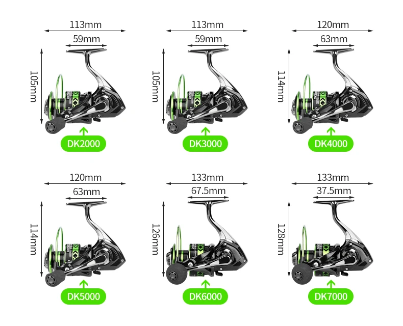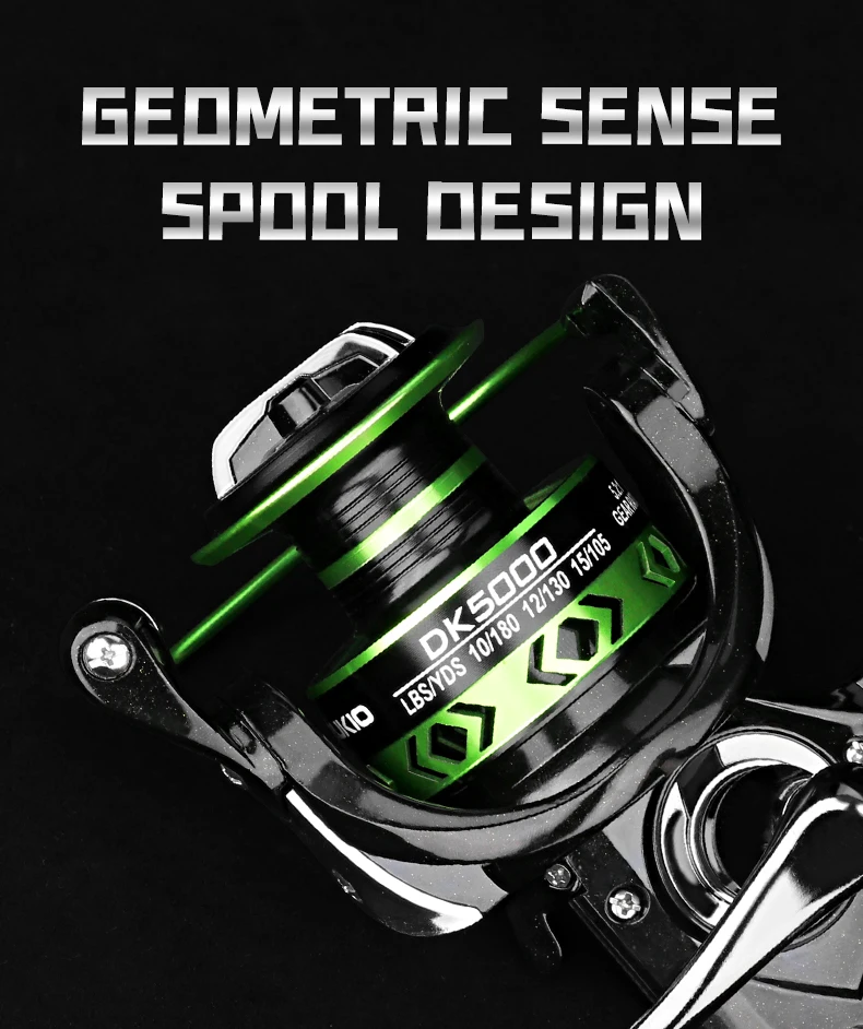 【Especificación】 Aleación de aluminio del Material】Aluminum del � 【Color】 Negro verde 【Tipo】 DK2000,DK3000,DK4000,DK5000,DK6000.DK7000 【Relación de velocidad】 5,2: 1 【Color box】 2000-5000 13*12.5*7.6cm/ 6000-7000 15.2*14.3*9.4cm 【Features】 1. deslumbrante recubrimiento en polvo de oro, diseño hueco más elegante 2. rodamiento cerrado, a prueba de polvo e impermeable 3. diseño geométrico de la taza del hilo, capacidad grande, sentido hueco de la moda del ojo verde del diamante 4,45 ° Gran chaflán, la línea es más suave, lanzar no se sacude 5. asiento de rueda integrado de metal, grueso y grueso, estructura fuerte