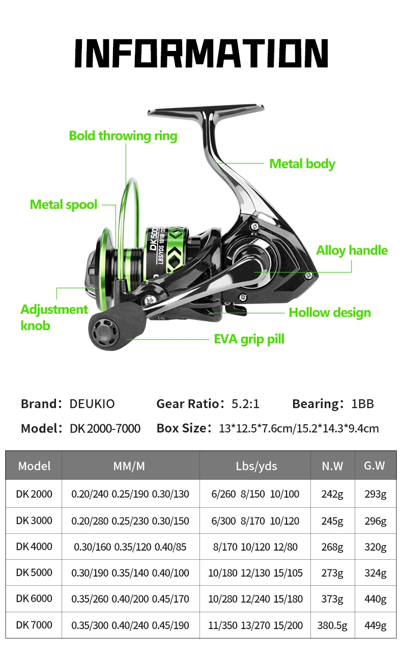 【Especificación】 Aleación de aluminio del Material】Aluminum del � 【Color】 Negro verde 【Tipo】 DK2000,DK3000,DK4000,DK5000,DK6000.DK7000 【Relación de velocidad】 5,2: 1 【Color box】 2000-5000 13*12.5*7.6cm/ 6000-7000 15.2*14.3*9.4cm 【Features】 1. deslumbrante recubrimiento en polvo de oro, diseño hueco más elegante 2. rodamiento cerrado, a prueba de polvo e impermeable 3. diseño geométrico de la taza del hilo, capacidad grande, sentido hueco de la moda del ojo verde del diamante 4,45 ° Gran chaflán, la línea es más suave, lanzar no se sacude 5. asiento de rueda integrado de metal, grueso y grueso, estructura fuerte