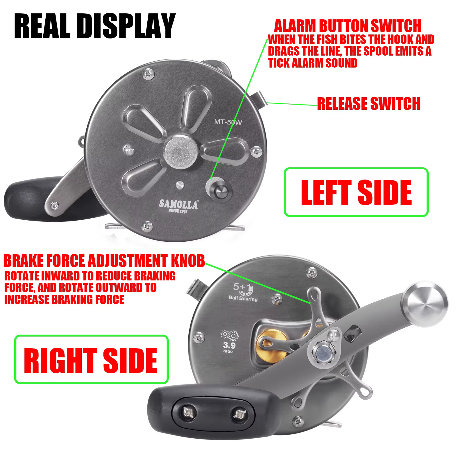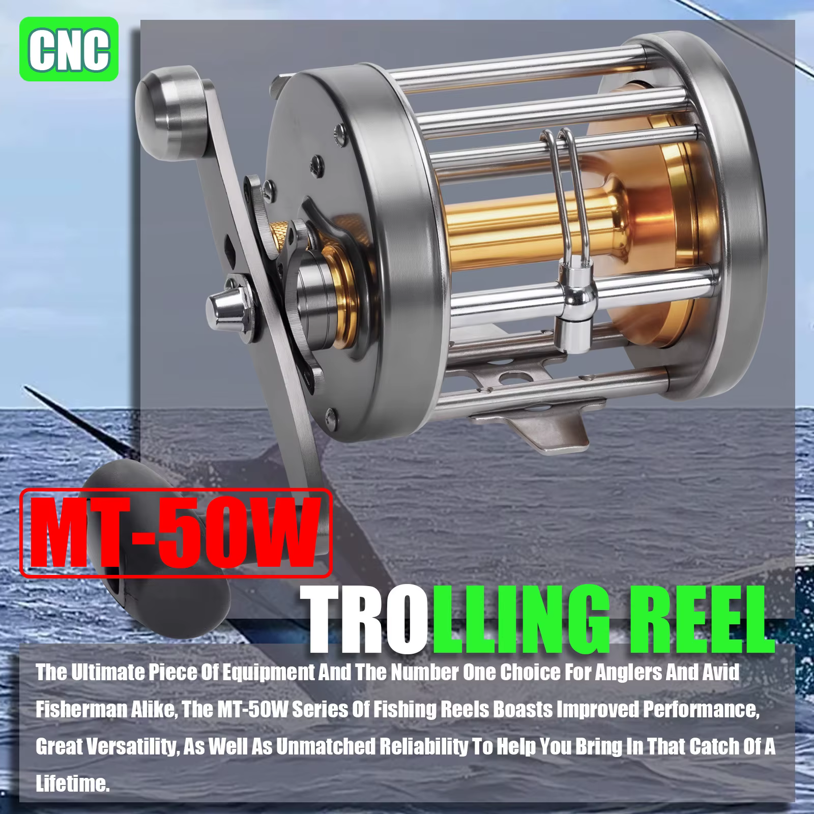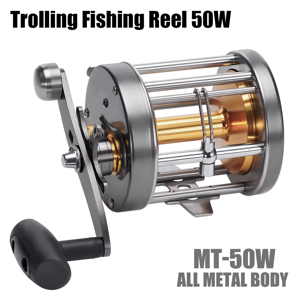 Carrete de pesca Trolling serie 50W cuerpo principal de acero inoxidable, carrete de aluminio, botón de alarma ajuste de fuerza de freno carrete de aguas profundas