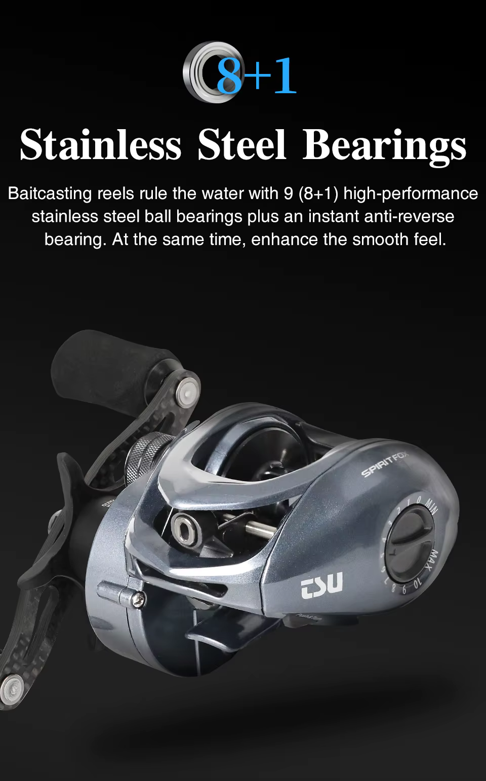 Ambos extremos del carrete utilizan rodamientos de acero inoxidable NMB para mejorar la precisión y suavidad del lanzamiento.