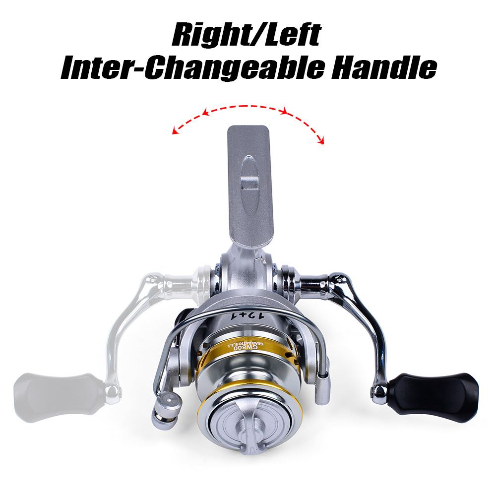 Especificación: GW800 Relación de velocidad: 5,2:1 Rodamiento: 12+1BB Tensión máxima: 8kg Peso neto del ferry de pesca: 143 g Peso de la caja de color: 39 g