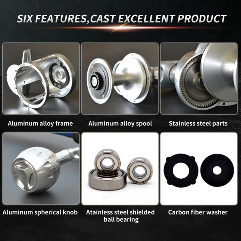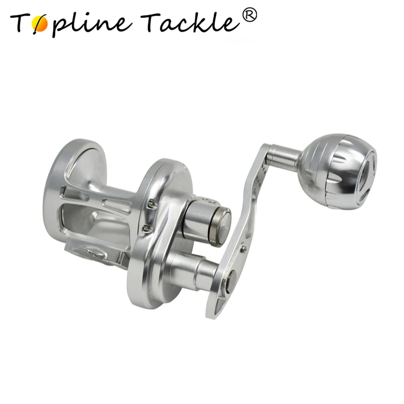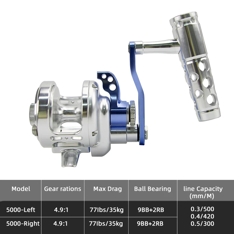 Carrete de Jigging de Baja Velocidad Azul Plata con Manivela Derecha y Diseño de Perilla. Relación de Engranaje 4.9:1. Ligero, Ideal para Pesca en Alta Mar.