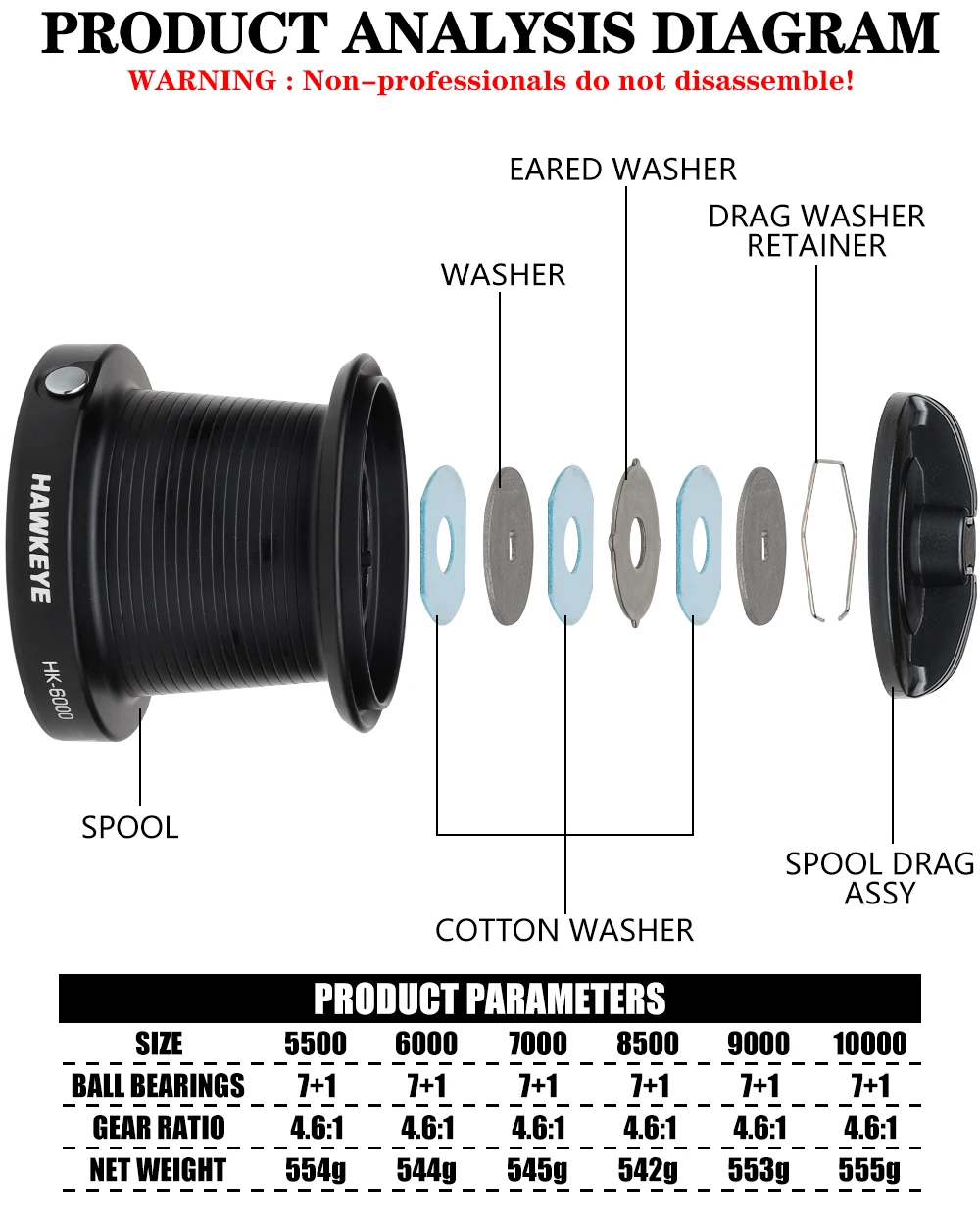Carrete hermoso hecho. La norma se ha convertido en fibra pesada 8500. La lengua tiene un poco de profundidad. Si hay pines de repuesto a la venta, recomiendo tomarlos, la calidad no es mala.
