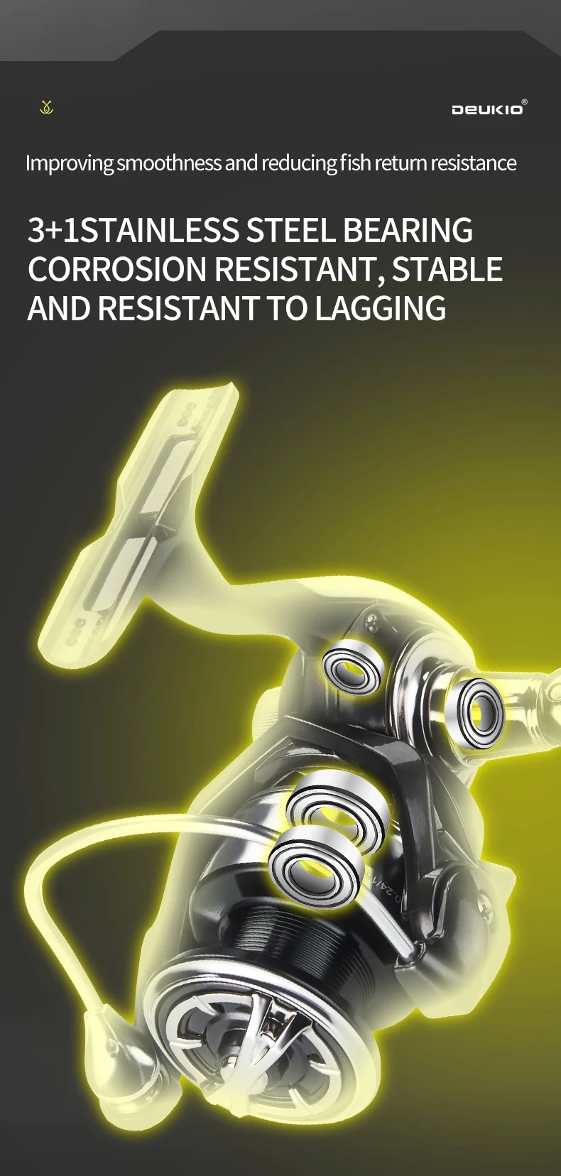10. Rodamientos de acero inoxidable de precisión 3+1, resistentes a la corrosión, resistentes a la temperatura, mejoran la suavidad y reducen la resistencia al retorno de los peces.